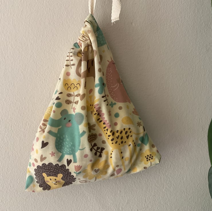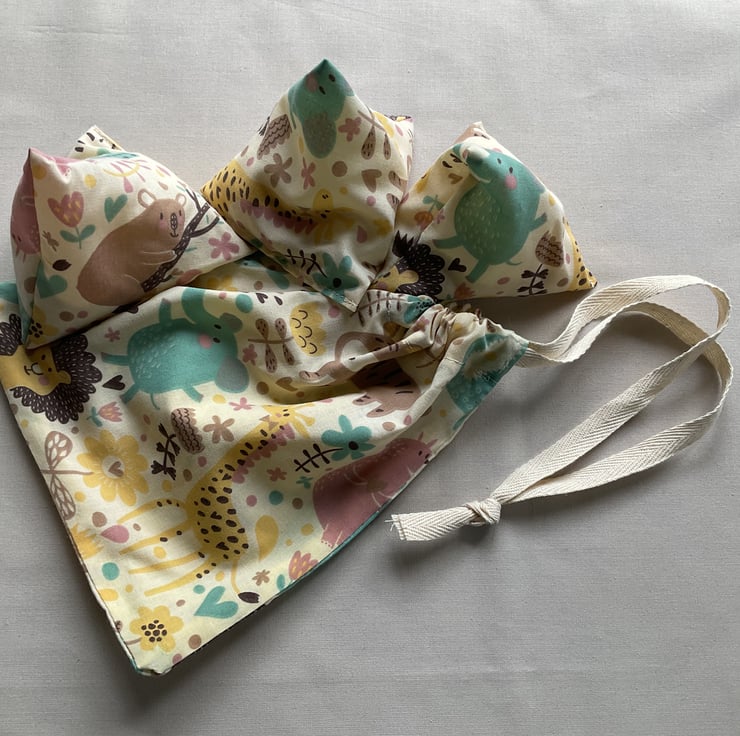 Three little triangle rice filled bean bags that come with a little storage bag to keep them in.