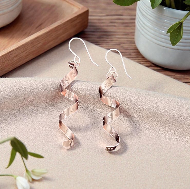 I have made these earrings using solid copper sheet which I have cut, sanded, added moon/star symbols, polished and curled into spirals.