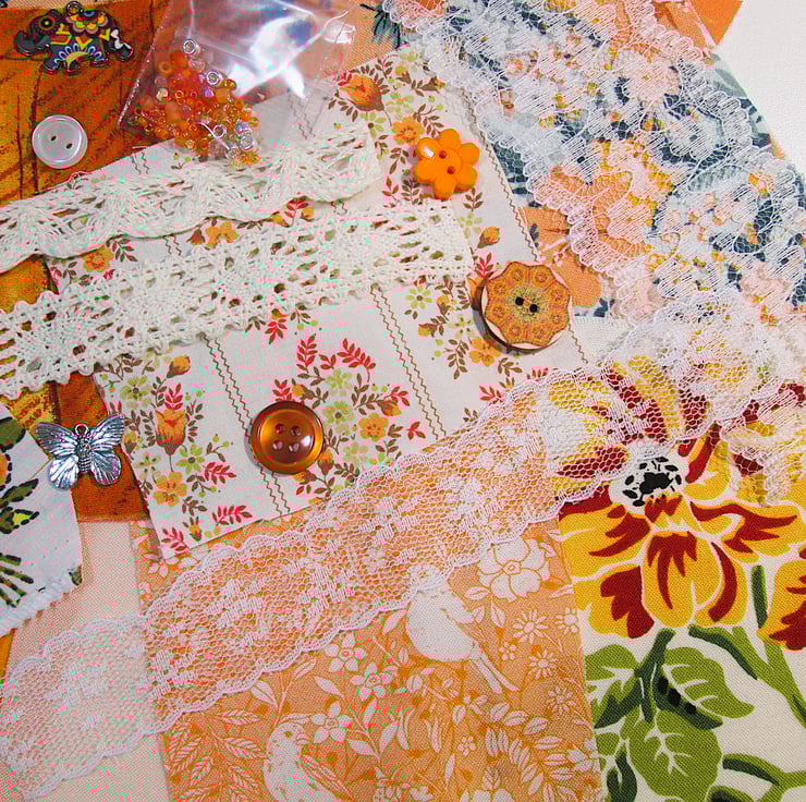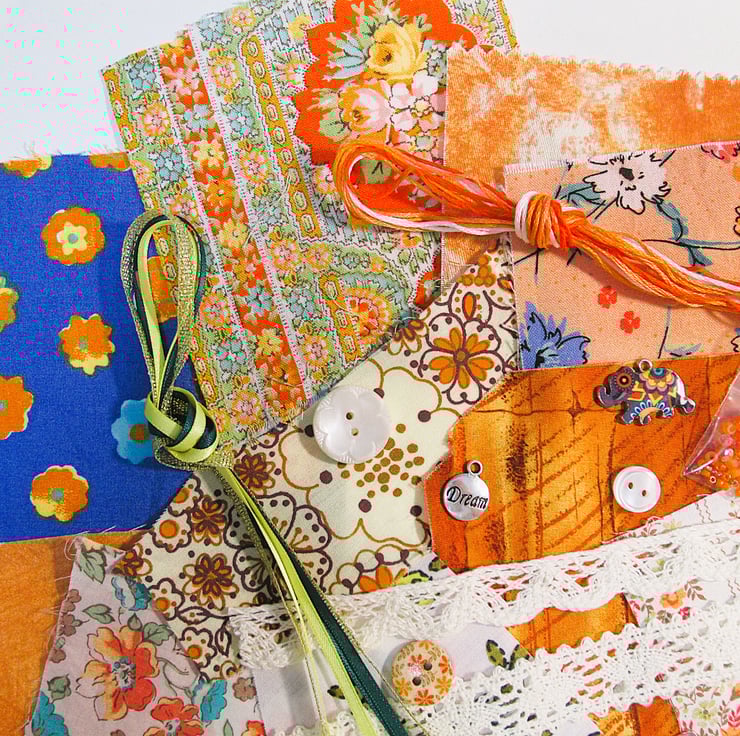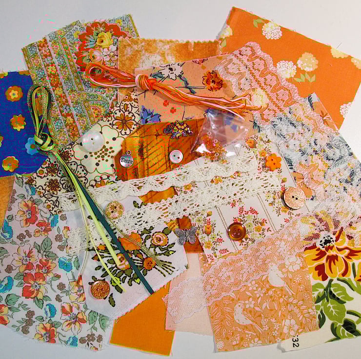 16 pieces of different sized fabrics (sizes range from 1 inch square up to 4.5 inches square)