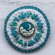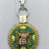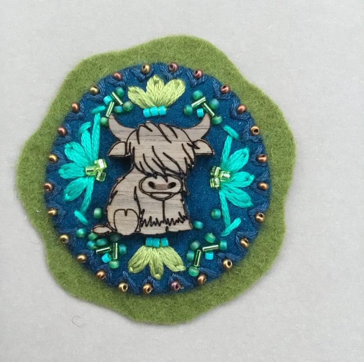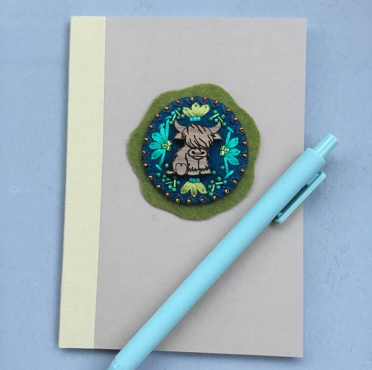 This Hand Embroidered Highland Cow Notebook and Pen Set has a Highland scene embroidered on its pale brown front cover. A wooden Highland Cow button is sewn onto circles of dark blue and olive green wool felt. This Highland Cow is surrounded by hand embroidered Lazy Daisy and Straight Stitches, with bugle and seed beads, in pale olive green, turquoise and copper colours.