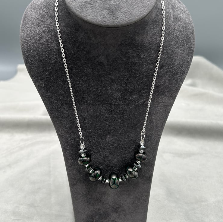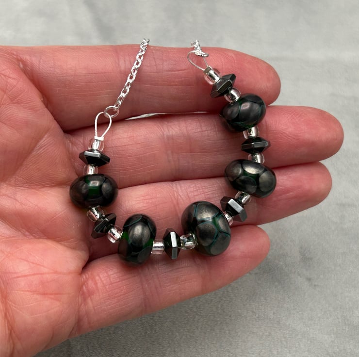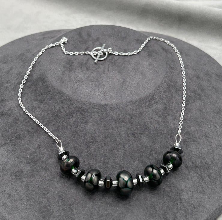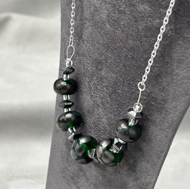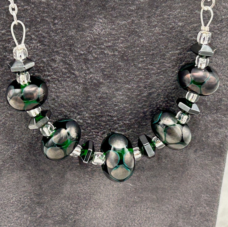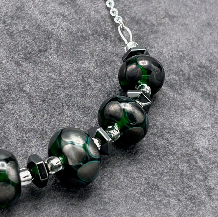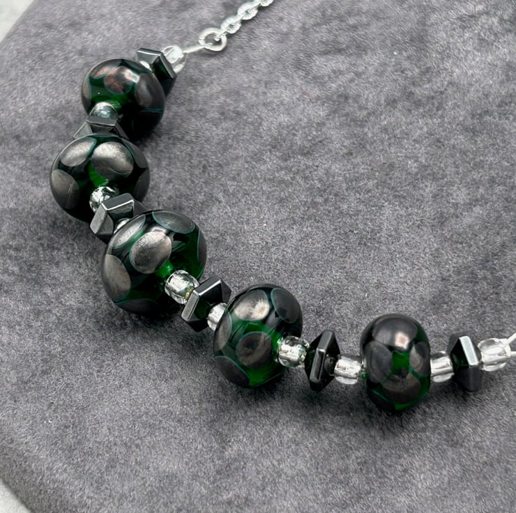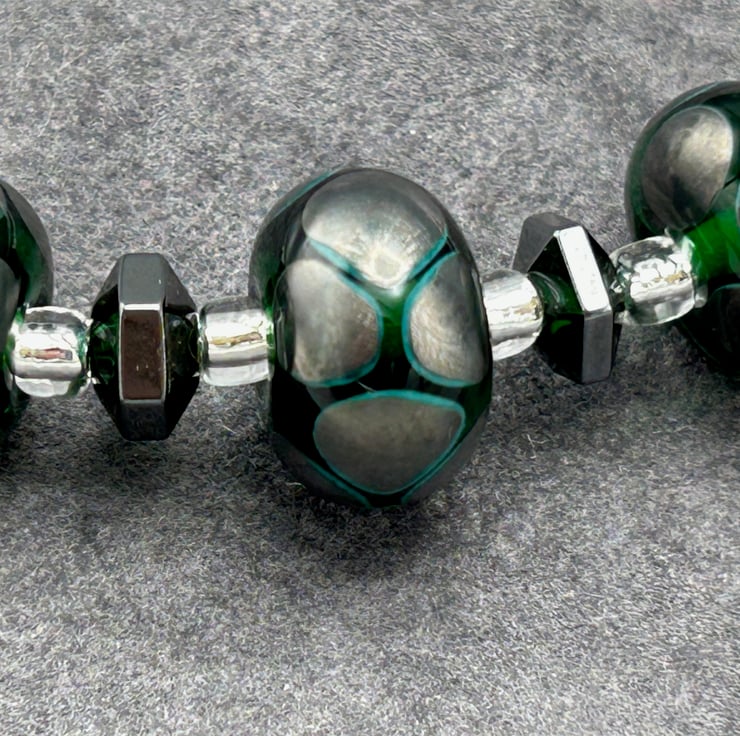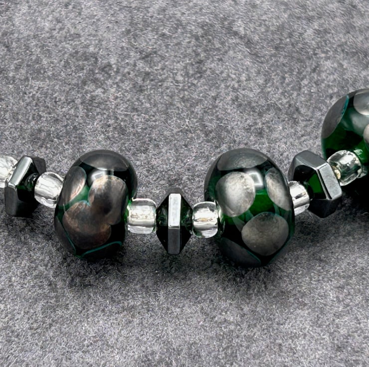 I used 5 of my handmade lampwork glass beads in the design of the necklace; a dark green transparent glass base with spots of copper green glass melted onto these which when treated in the flame go a dark metallic colour with a paler green edge. These beads are 14.5mm (middle) - 12.5mm (outer) and are combined with silver lined seed beads and haematite beads when strung on the nylon coated silver coloured wire.