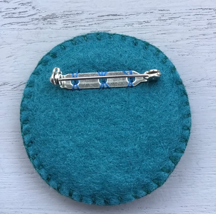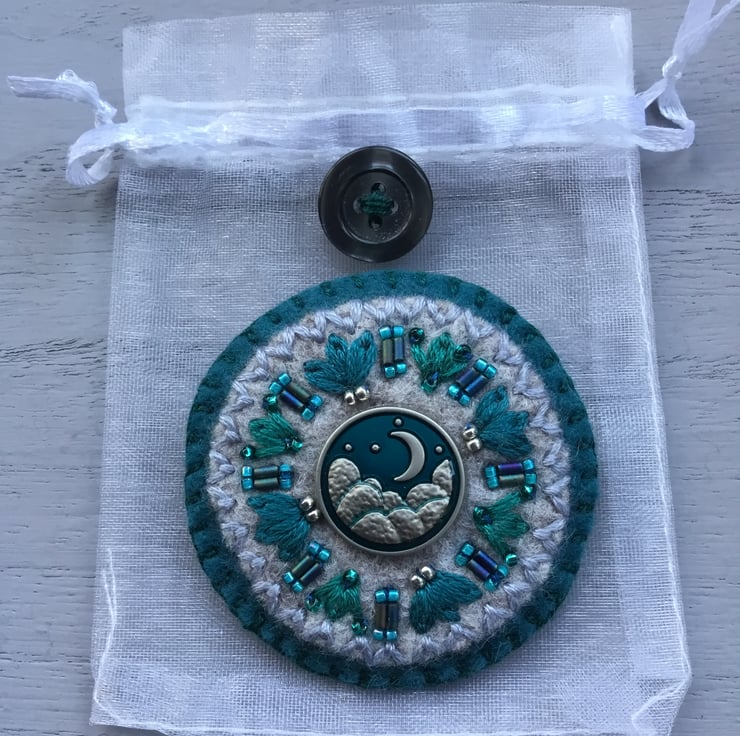 This Hand Embroidered Crescent Moon Brooch has a lovely metal button at its centre, showing the crescent moon in the starry night sky. This button is sewn on circles of grey and jade green wool felt. A circle of hand embroidered Lazy Daisy Stitches with bugle and seed beads in jade green, surround this button.
