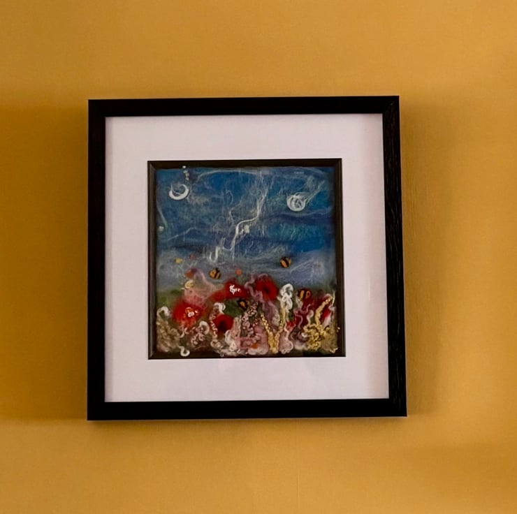 This beautiful textile art has shimmering silk throwers waste for the clouds, little bees flying amongst the poppies and dyed Wensleydale wool at the bottom. The picture itself is approximately 20cm x 20cm.