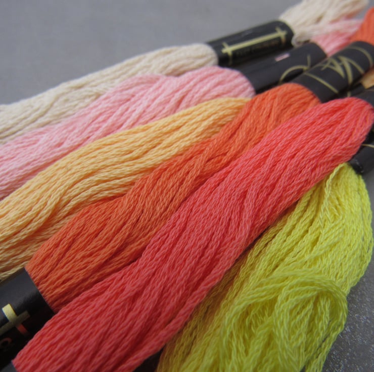 100% cotton stranded embroidery threads in mixed pink, orange and yellow
