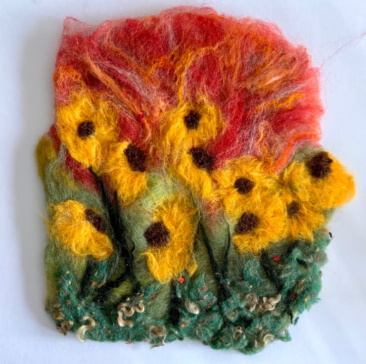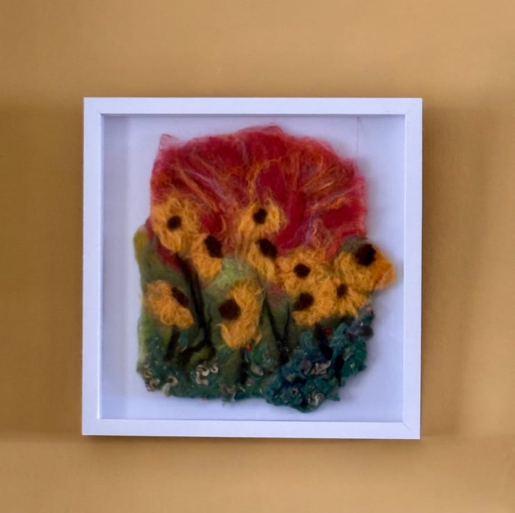 'Sunflower Radiance' is a unique needle and wet felted picture using wool. It is secured on a 30cm mount ready for you to display in your own frame.