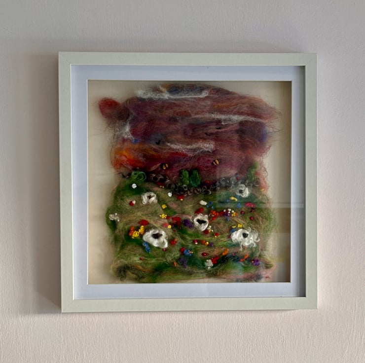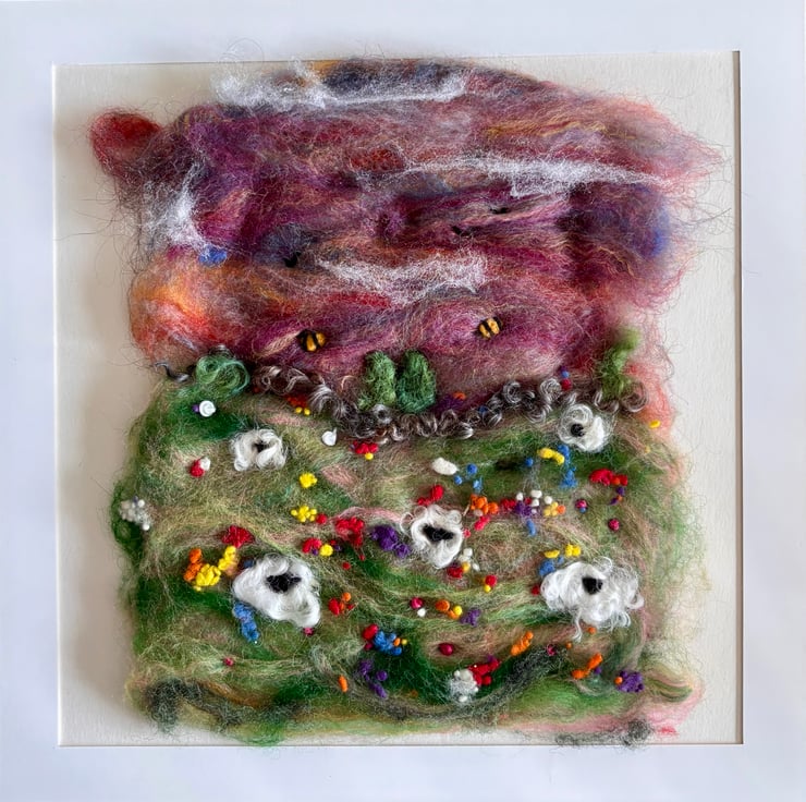 This beautiful textile art has Wensleydale woolly sheep, little bees flying around, a scattering of wool nepts and dyed Wensleydale wool on the horizon.