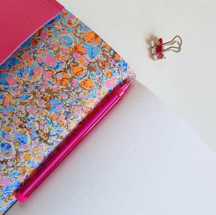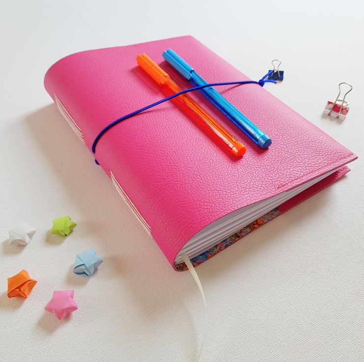 Hand Bound with Bright Pink Italian Leather and lined with a lovely splash marble paper. There are pockets in the front and back of the Journal and it is closed with an Elastic Loop pulled over the Journal. There is a handy Ribbon Page Marker and the Journal lies completely flat when in use. There is an option to have a Pen Loop too.