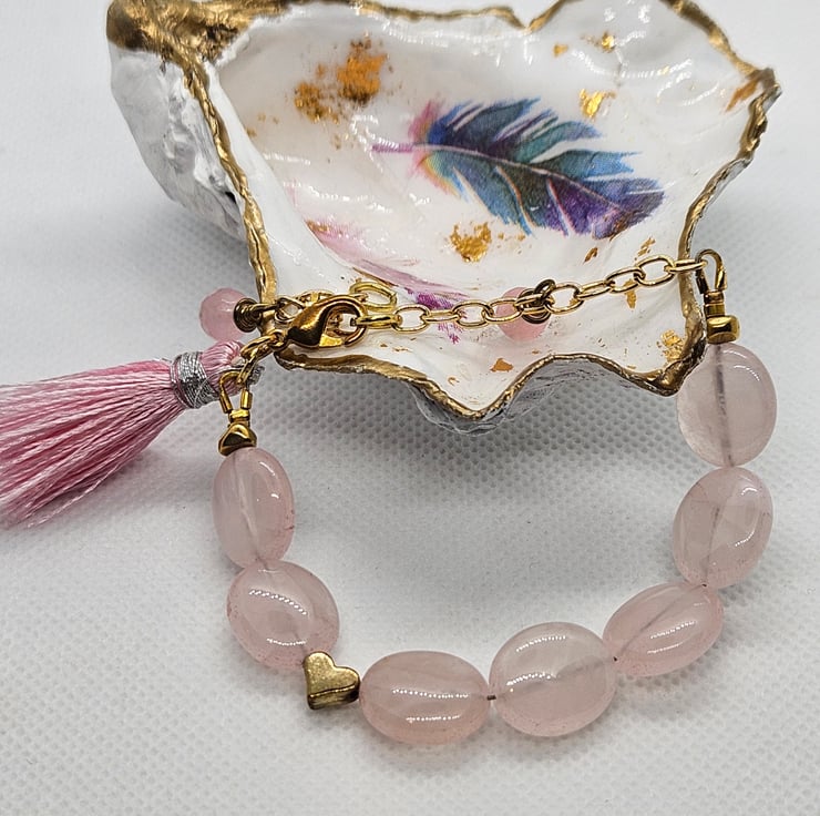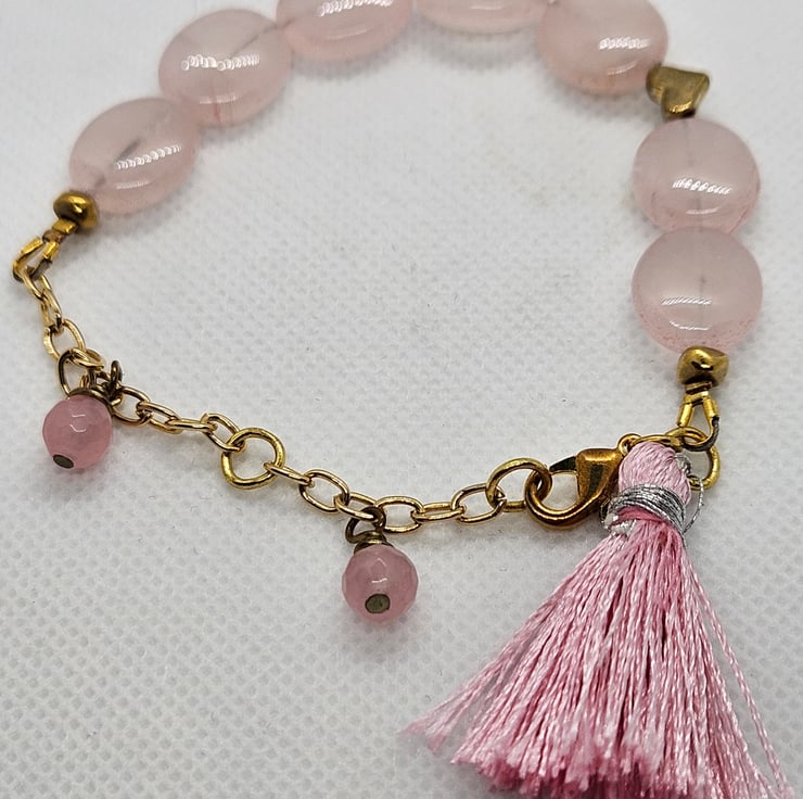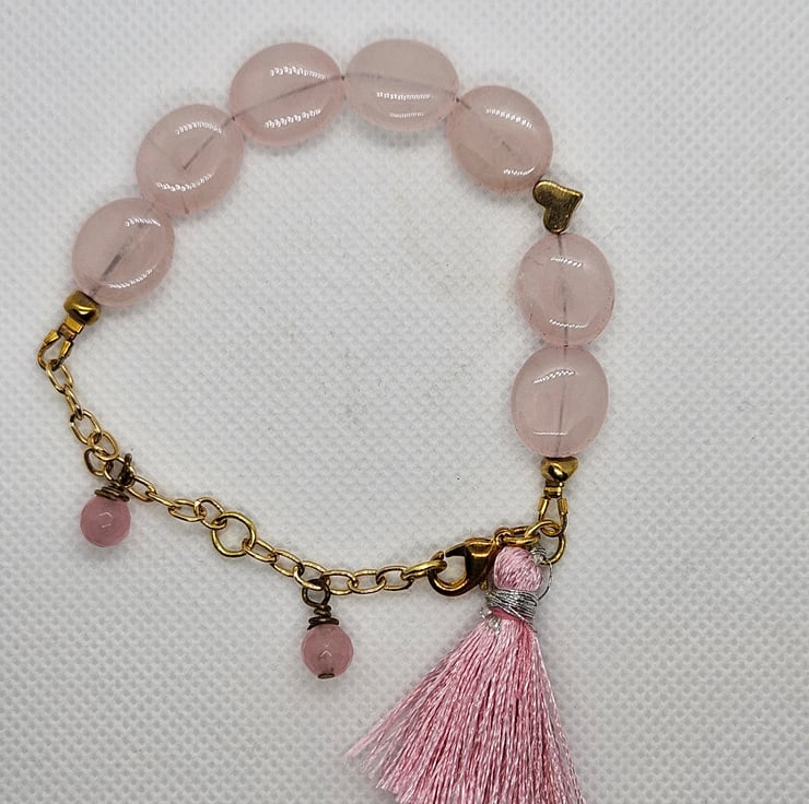 Gorgeous pale pink rose quartz ovals with gold plated chain accented with a little gold toned heart. A couple of slightly darker pink faceted rose quartz dangles from the chain alongside a small pink tassel. This is such a feminine piece. The feel of the quartz ovals reminds me of worry stones. There is an extender chain which extends the bracelet to a maximum length of 8". This charming little bracelet will be gifted in a small burlap or hessian drawstring bag.