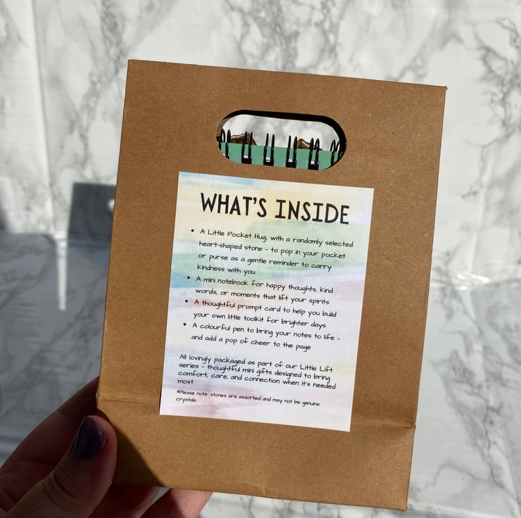 Please note the stones for the pocket hugs and colour of notepad & pen will be randomly selected for each set.