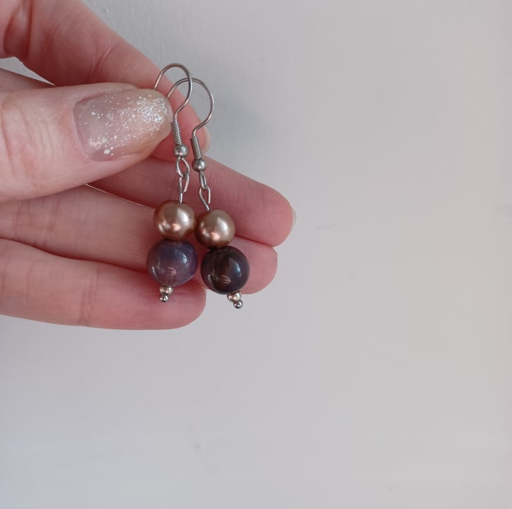 A pair of handmade drop earrings featuring a dark brown bead and a caramel pearl bead. Perfect for jazzing up your daytime look or accentuating an evening outfit!