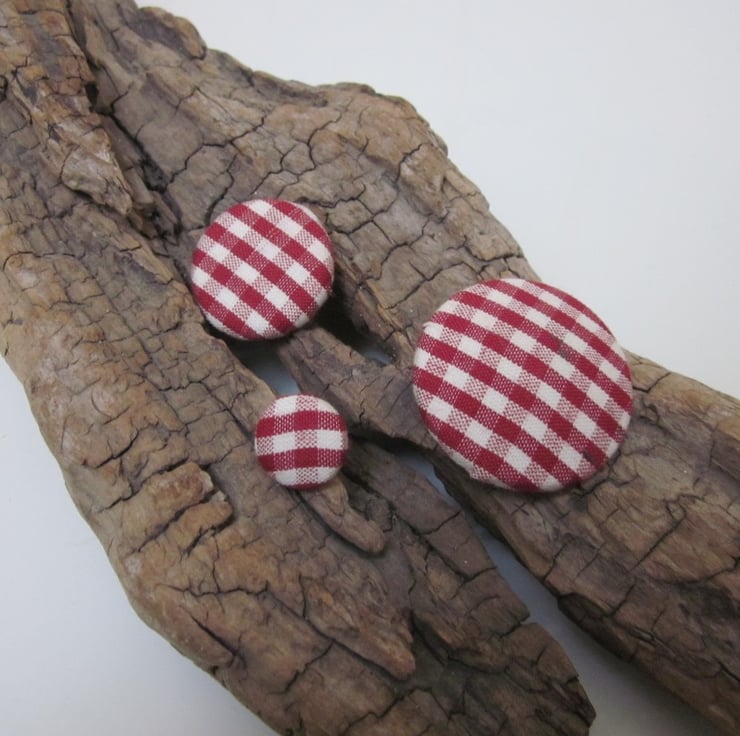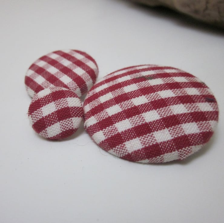 3 handmade buttons covered in organic red and natural cotton gingham over a metal shanked base