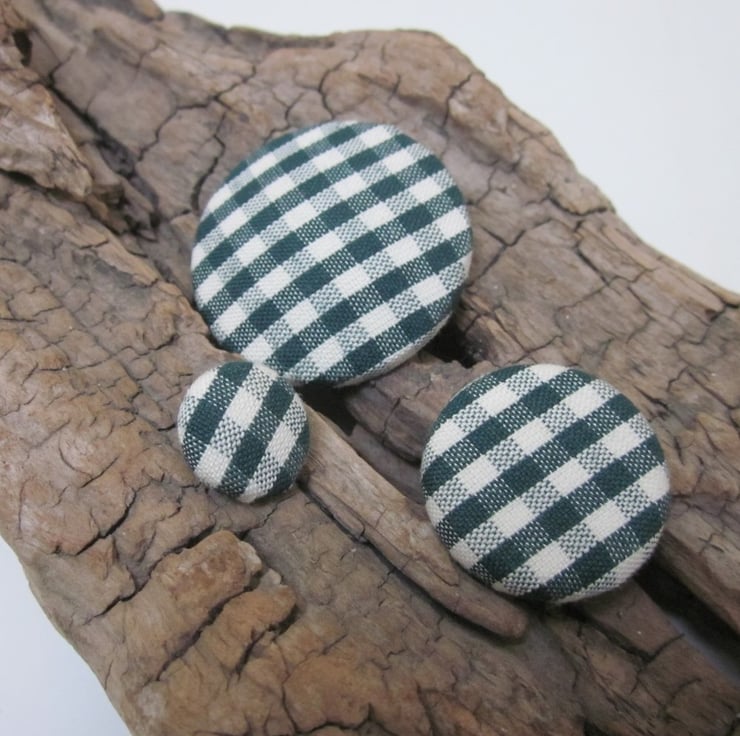 3 handmade buttons covered in organic bottle green and natural cotton gingham over a metal shanked base