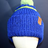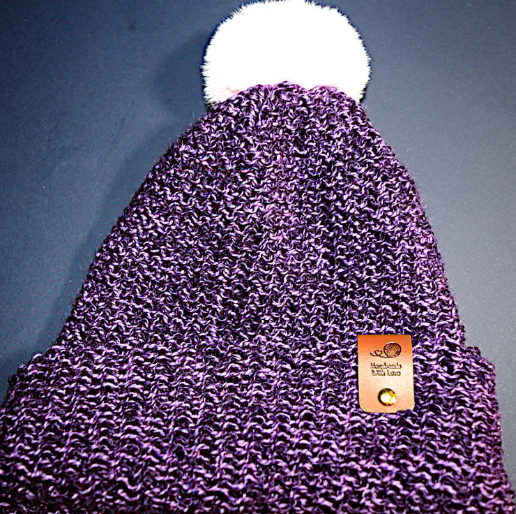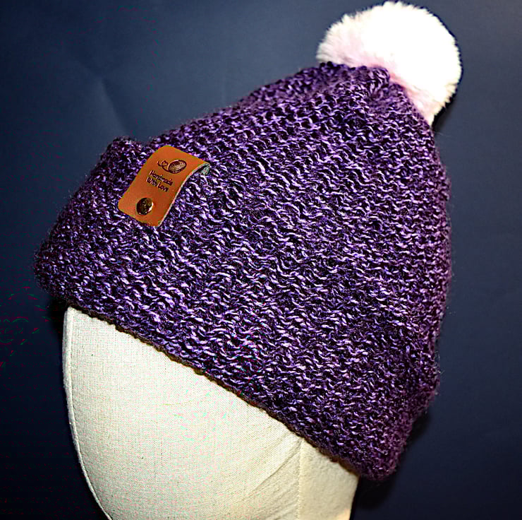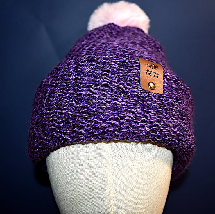 A purple blend hat, along with the baby pink faux fur pom pom.