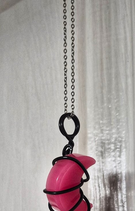 This handmade necklace features a vibrant pink glass piece, carefully hand wrapped in dark-toned wire to create a bold, sculptural pendant. The bright colour of the glass contrasts beautifully with the darker wire, giving the necklace a striking yet wearable look.