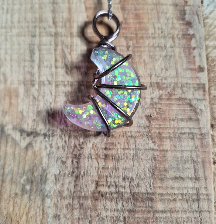 This handmade necklace features an iridescent resin crescent moon, carefully hand wrapped in bronze-toned wire. The resin catches the light beautifully, with a subtle glitter effect that shifts colour as it moves.