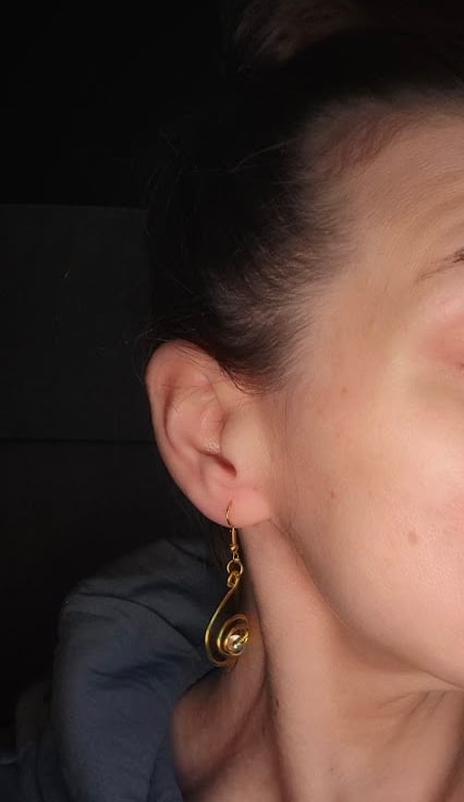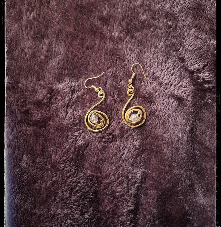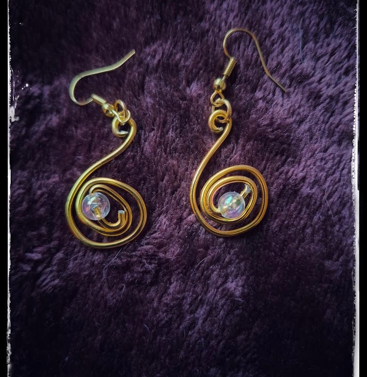 These handmade gold wire swirl earrings feature a delicate spiral design wrapped around a shimmering iridescent bead that catches the light beautifully. Each pair is carefully shaped by hand, giving them an organic, slightly whimsical feel.