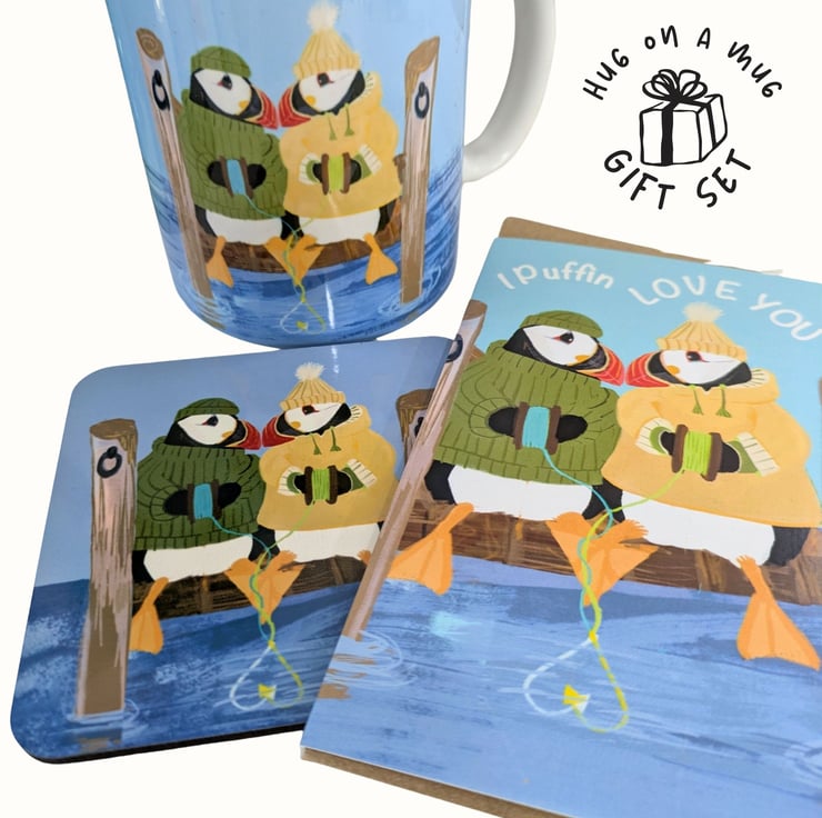 Tell someone you ‘Puffin Love them’ with a perfect gift for valentine that can be used all year. Everytime your loved one has a cuppa they will receive a little extra love. The gift set includes a mug, coaster and card. All artwork is an original Hedgerow Artist design. Perfect for your valentine or galentine.