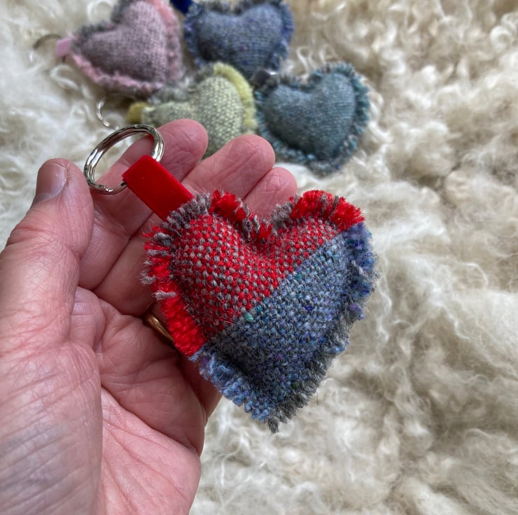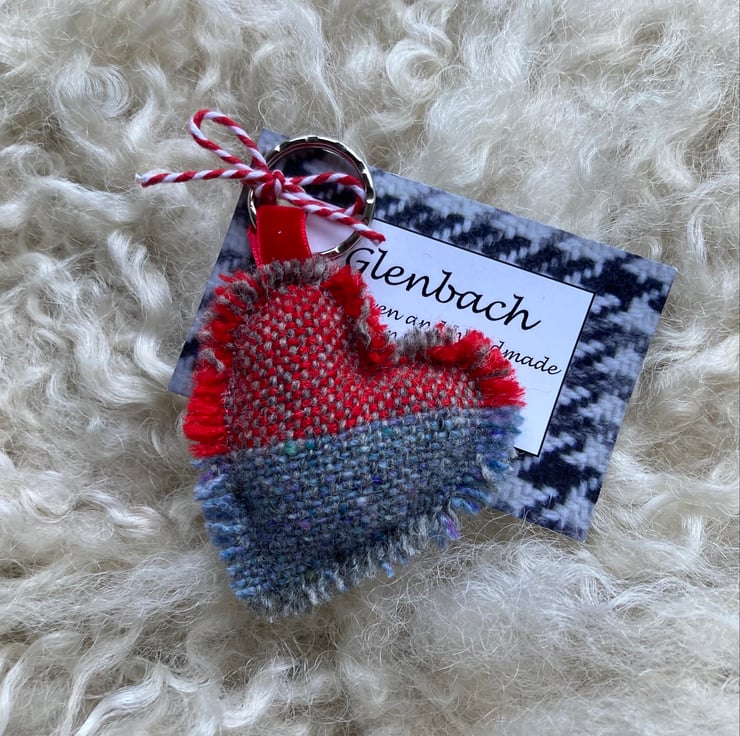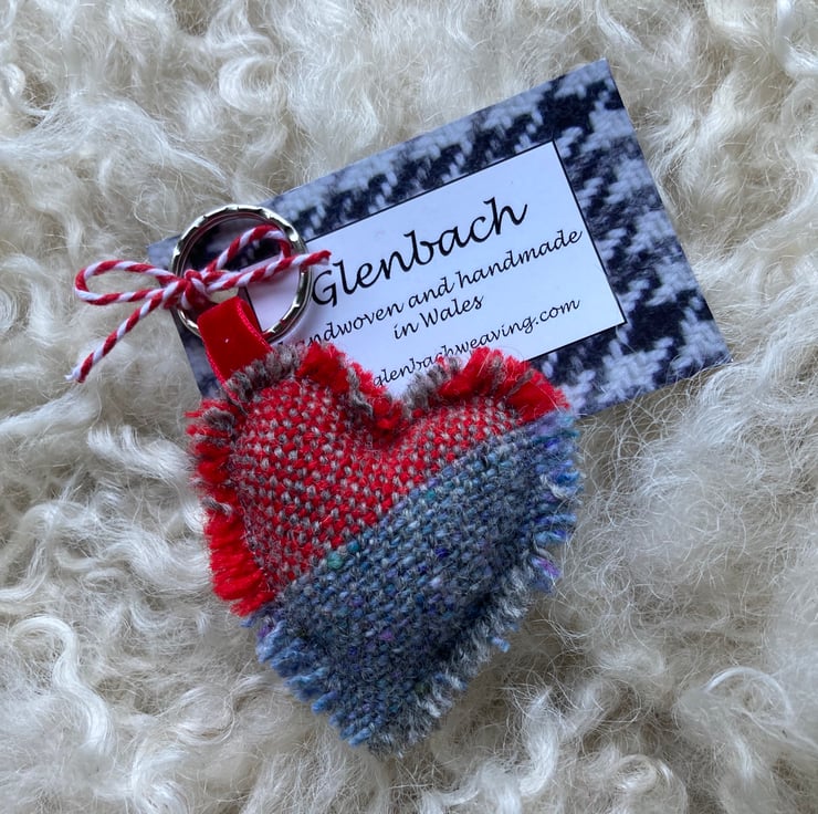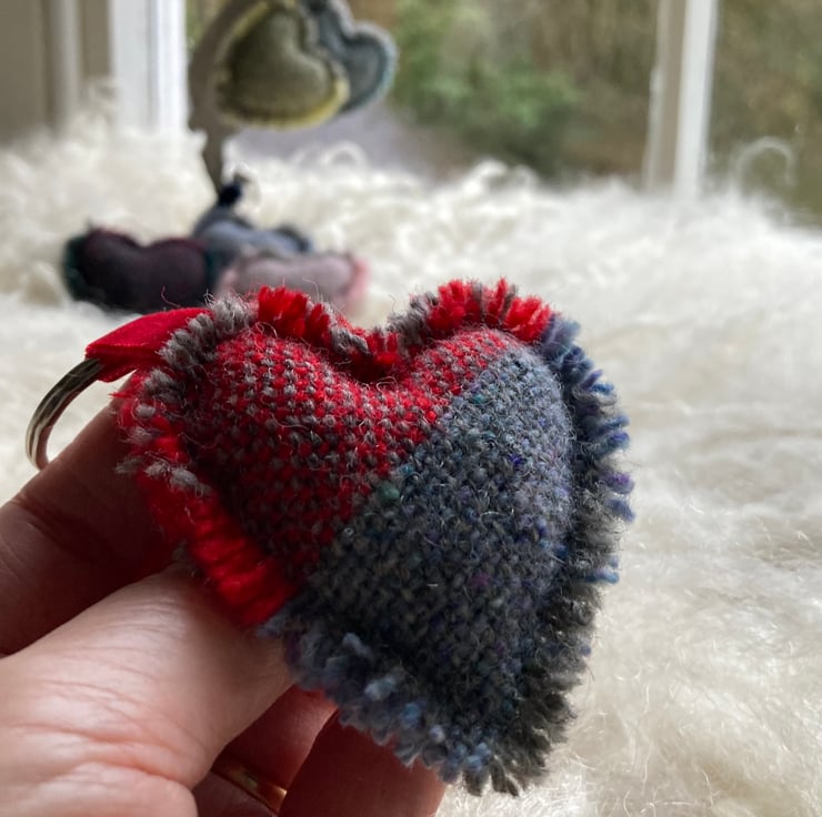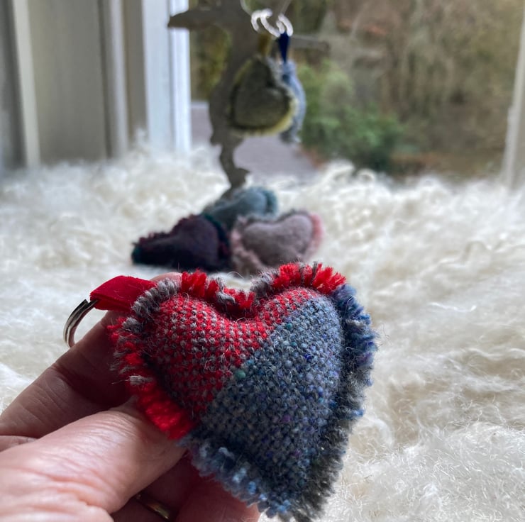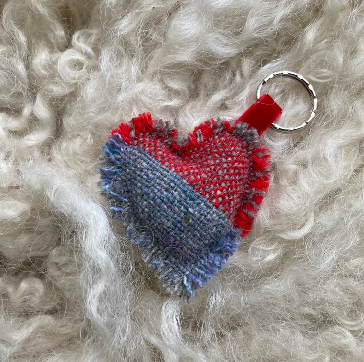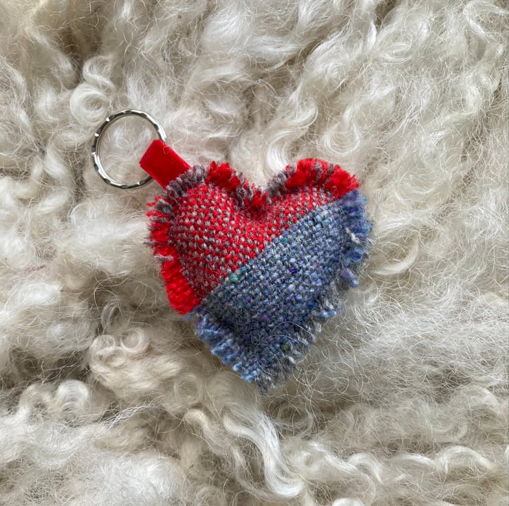 A woolly Heart Keyring - Red & Blue Donegal Tweed