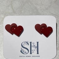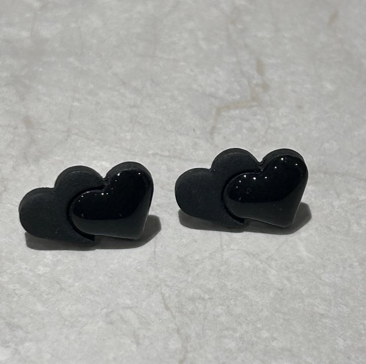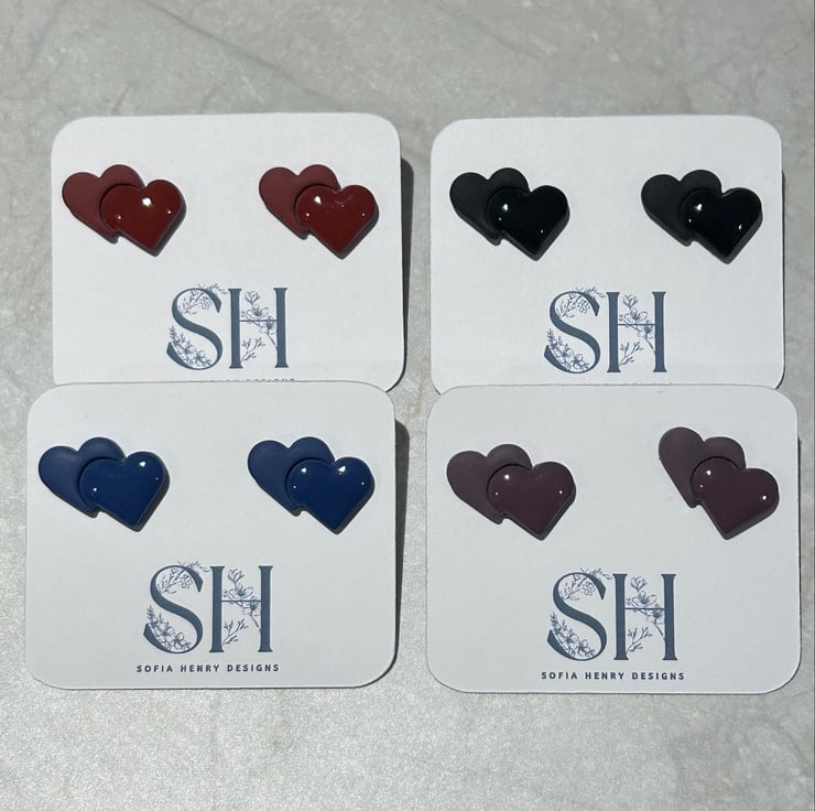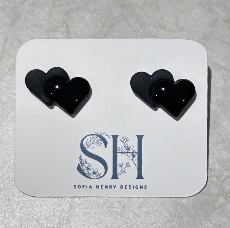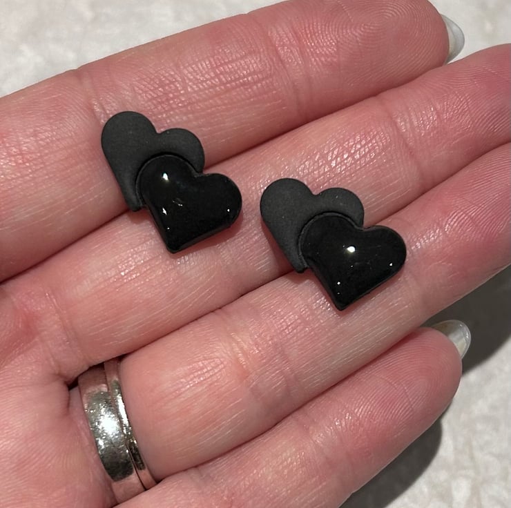 Add a little love to your everyday look with these handmade heart stud earrings! Each pair is carefully crafted from lightweight polymer clay, one heart is left Matt whilst the other is finished with a smooth, glossy resin shine for a modern yet playful style. Featuring a unique layered heart design, these studs offer subtle dimension while remaining comfortable for all-day wear.