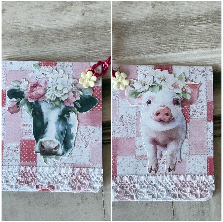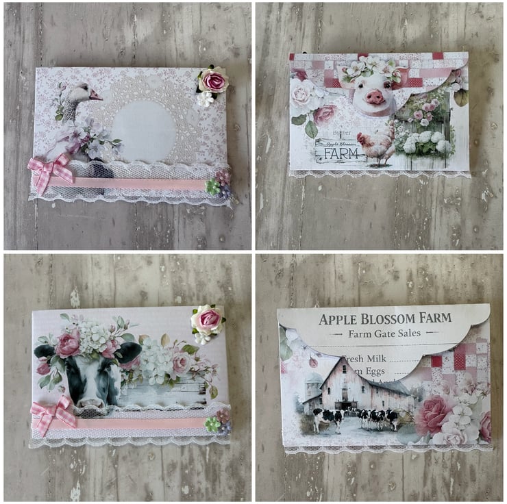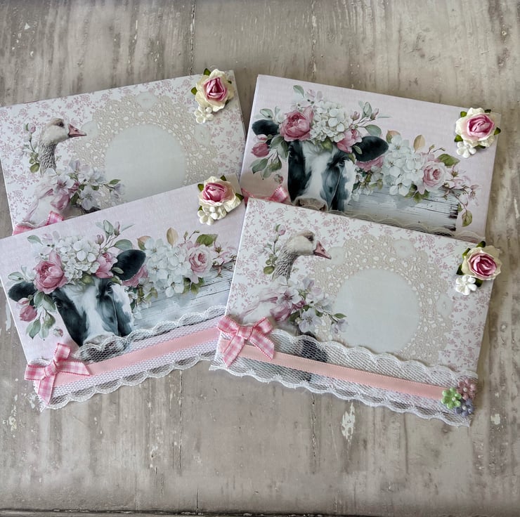 Money envelopes 4, 2 of each design. A pretty cow, looking over the fence, with flowers on her head, daisy barn on the back. A farm yard goose bouquet hanging from her neck, Chicken and cute piglet on the back. Each envelope has lace edging, rose, glitter flowers, ribbon and a gingham bow. Close with hook and loop closure.