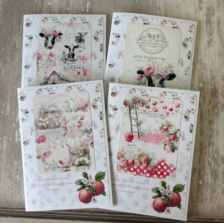 A stationery set with 4 5" x 7" cards, with collage toppers, apple blossom background paper with apples. Wording 'Apple Blossom Farm, at the end of Blossom Lane, Cloverfield. Insert apple blossom with a writing space. Inside of envelopes have matching paper to decorate.