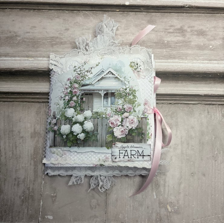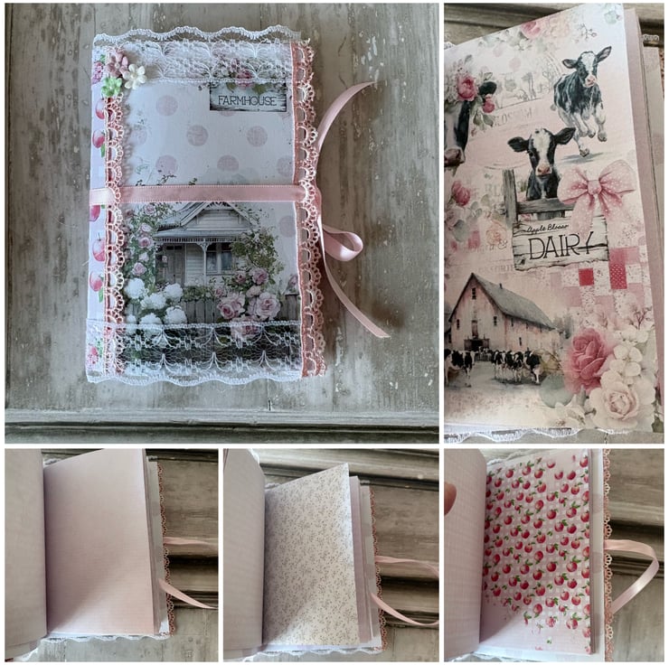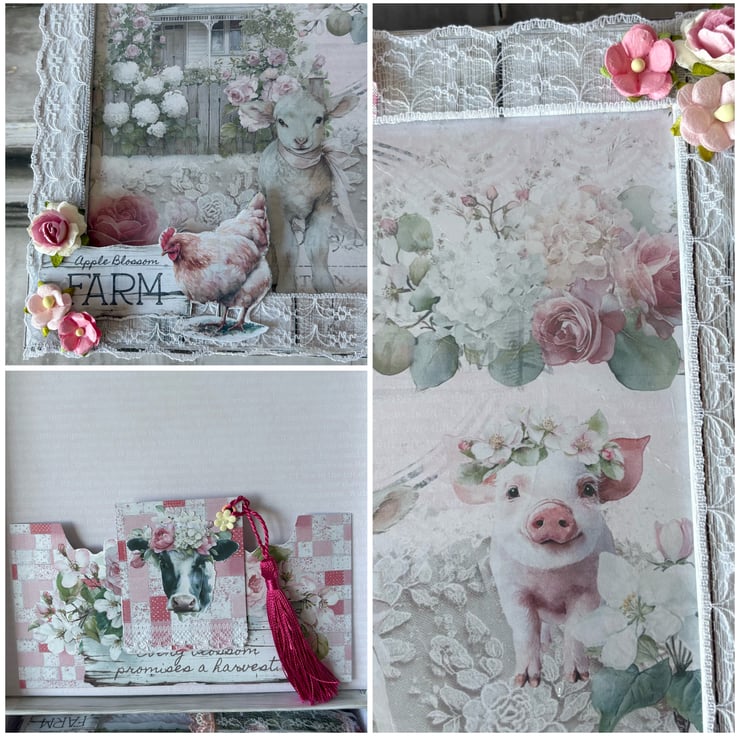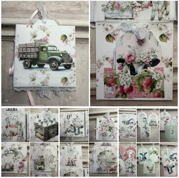 CD envelope flip folio with 10 pockets, 16 tags, 6 journalling cards. Images of the animals on a countryside for, edged with lac e and tied with pink ribbon. Each tag has lace and a mini flower at the top. Journalling cards in the main pockets have a lace topper to be able to remove easily. Measures closed approx 5" x 5". Fully open 15" x 20".Mini journal 80 patterned pages 5.5" x 4". Hidden paperclip 3" x 2.5" . gift box 8" square with a pretty collage print on the lid and a pocket inside lid.
