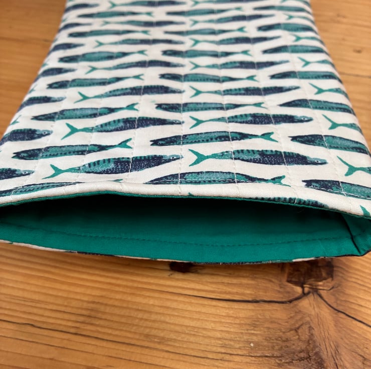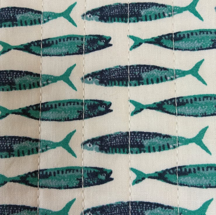 It is made in this lovely fish print fabric on a cream background.