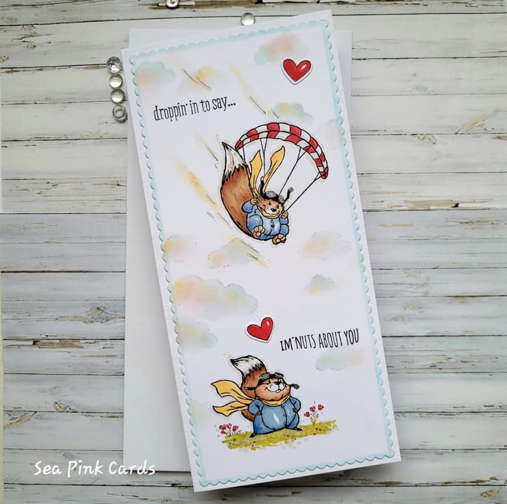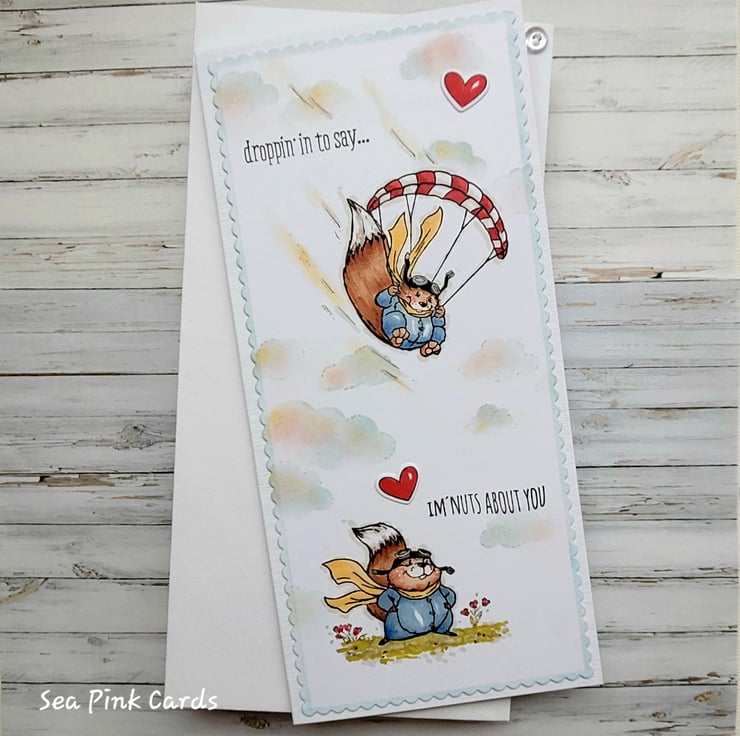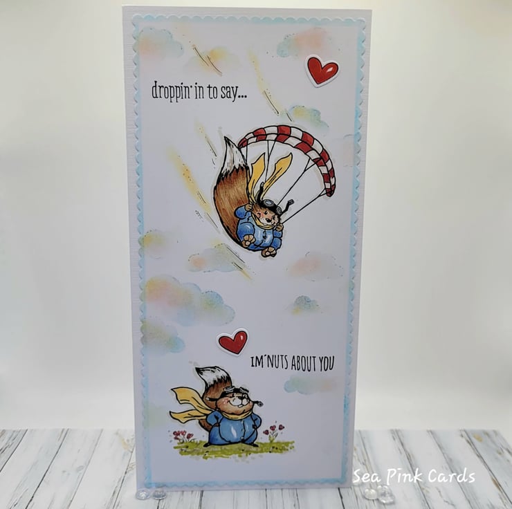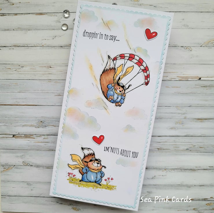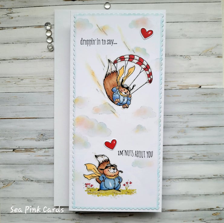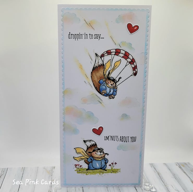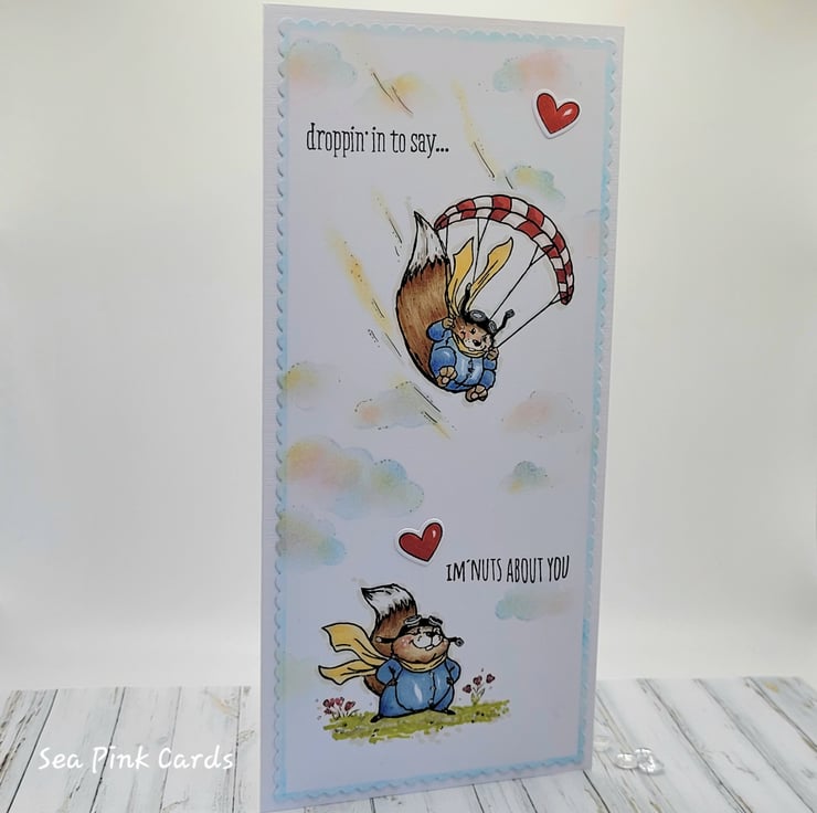 I stamped the outlines of the squirrels and the parachute and brought them to life by colouring them with artist graphic art pens and pencils. Small details are also added with fineliner pens and metallic gel pens. I created the sky with archival inks and stencil brushes. There are two red hearts that are also handstamped and die-cut. The sentiments on the front read... droppin' in to say ... and I'm nuts about you!