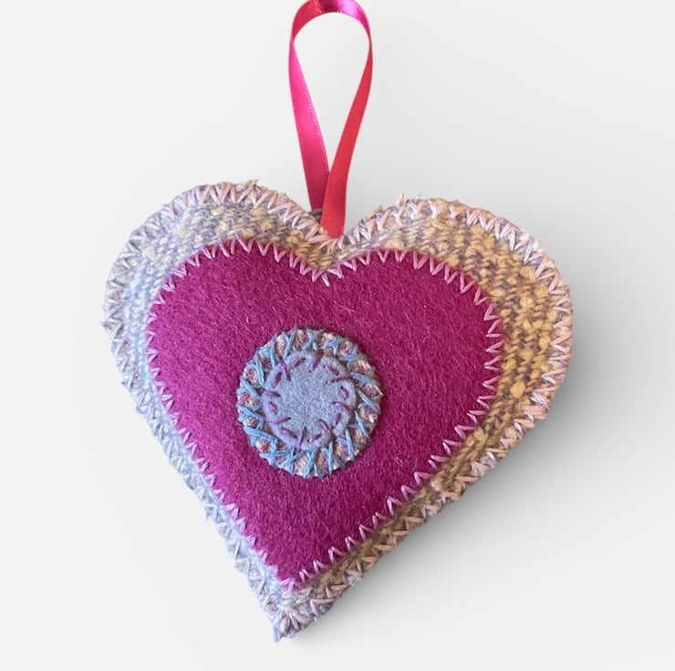 My inspiration for my Lavender filled heart is my love of textiles Folk Art artefacts and my aim to use traditional methods of hand stitching and embroidery, alongside working with fabrics such as Wool Tweed and Wool Felt to create a modern product reflecting traditional skills and techniques.