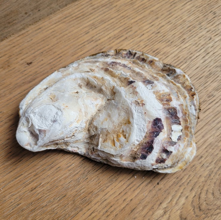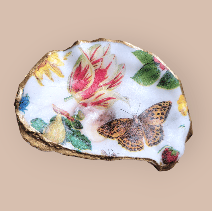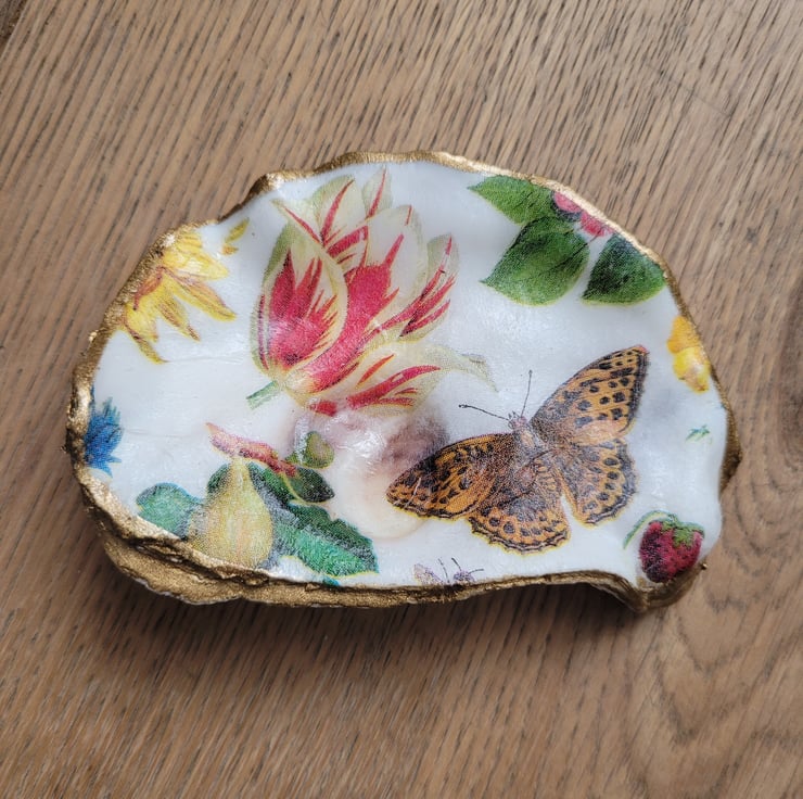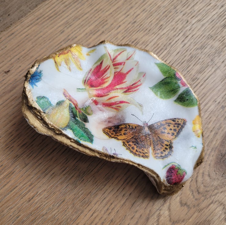 Made from a oyster shell, napkin and gold paint. Size: 4 x 3 inches (roughly - due to shape) Napkin - Napkin Shop from the Ambiente range. These are lovely to display in your home or use for small jewellery pieces.