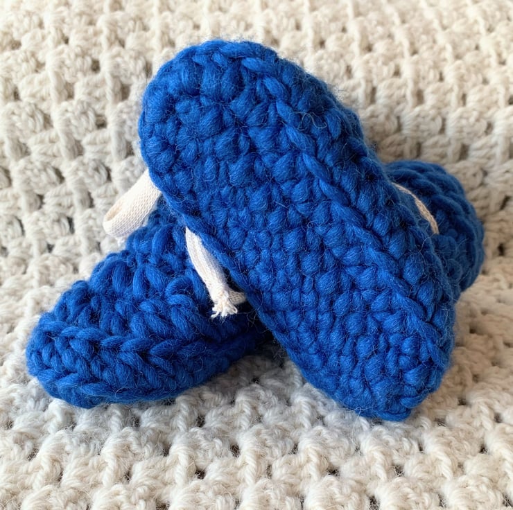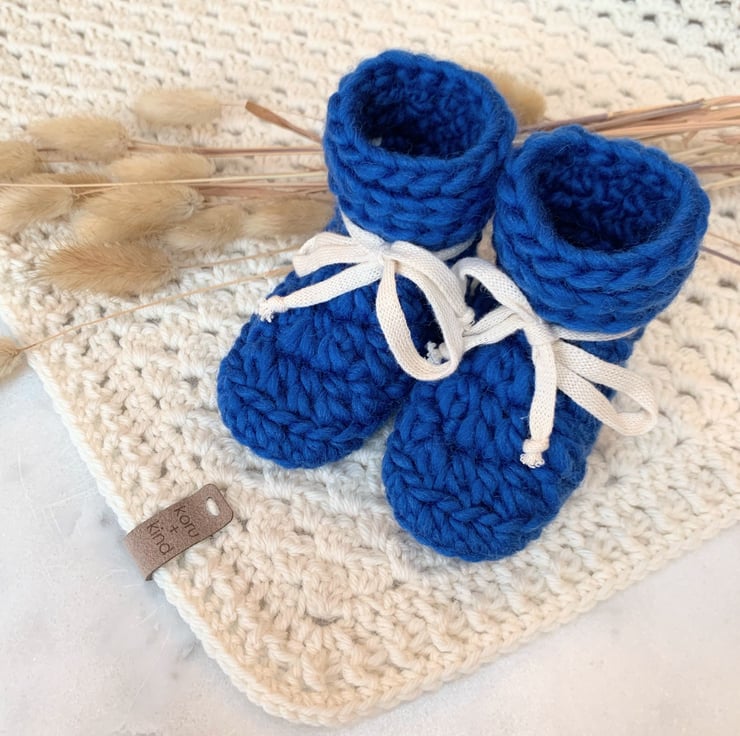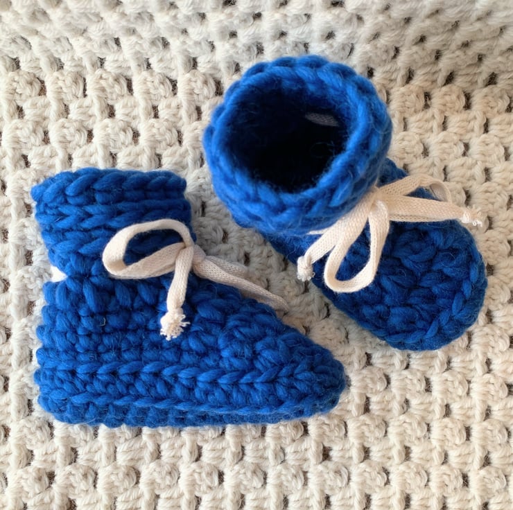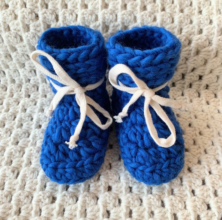 All natural fibres for these popular chunky style baby booties. Hand crocheted using 100% super chunky weight wool with 100% cotton ties, they will keep little feet toasty warm.