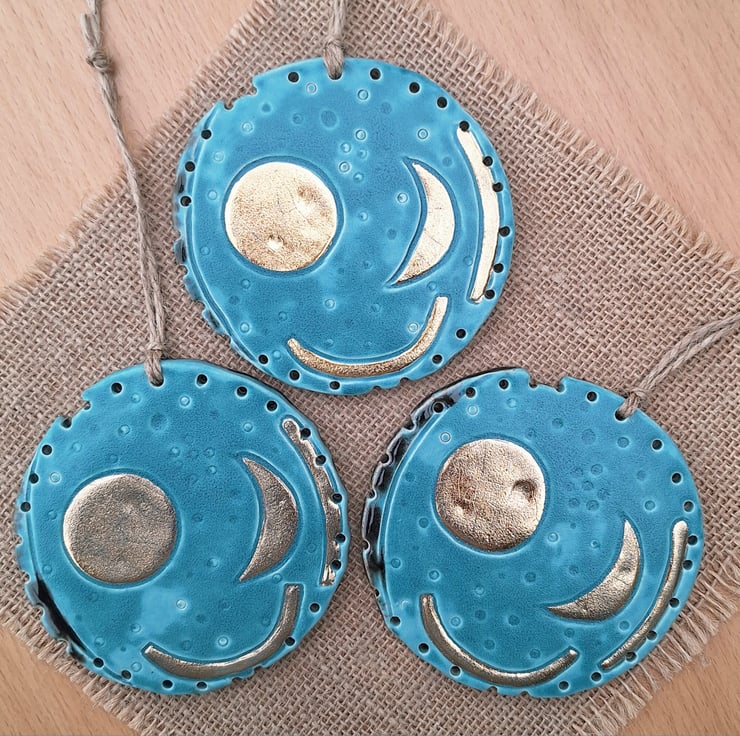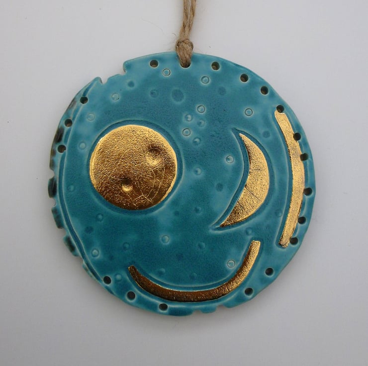A white earthenware decorative hanging 'Nebra Sky Disc' decoration, glazed with a beautiful satin turquoise finish, a touch of antique bronze and a whole lot of real 24k gold lustre!
