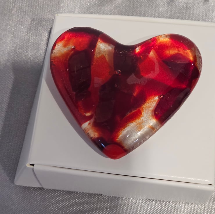 A perfect small gift to show someone you care for them. Or beautiful to keep or yourself. Many people find comfort in having an item to handle in their pocket. Hand cut and kiln fused, a unique item. Very tactile lightly textured underneath and glossy smooth on top. Will arrive wrapped in tissue and in a plain white box tied with ribbon. I am selling 4 in similar colours. It can be posted directly to the gift recipient with a printed message of your choice. Approximately 5cm/2" at the widest point. The gift box is 6cm/2.5" square. Please note outer packaging may be recycled.