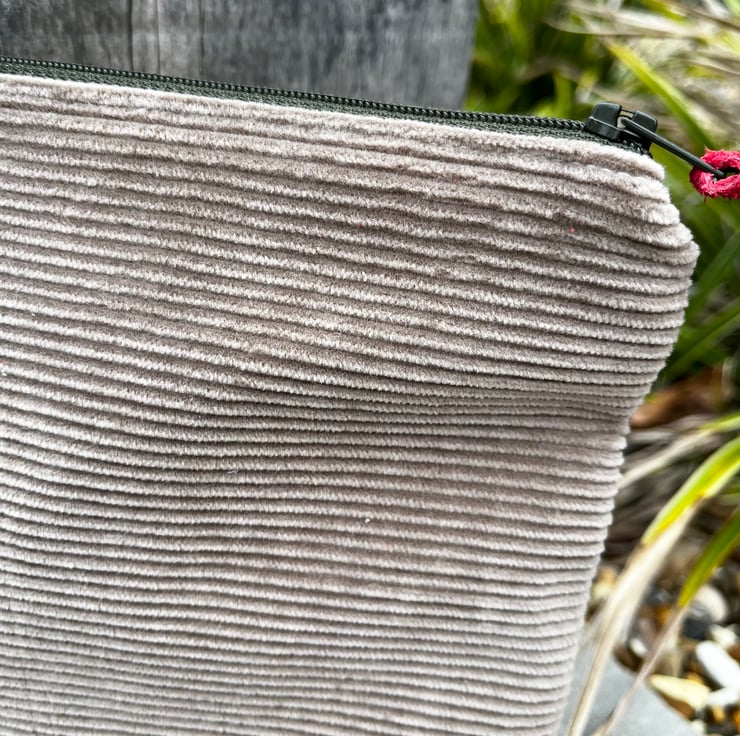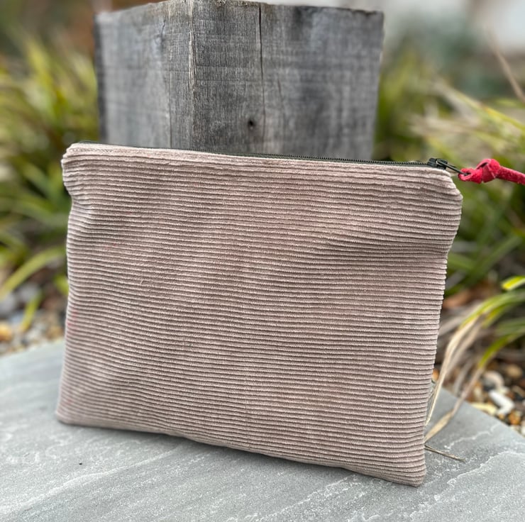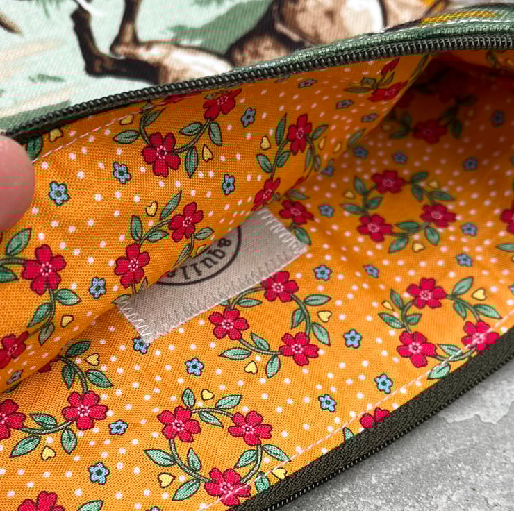 Fully lined with bright orange floral cotton. There is a strip of leather on the zip pull, this can be changed for ribbon if you prefer - just add a note at checkout.