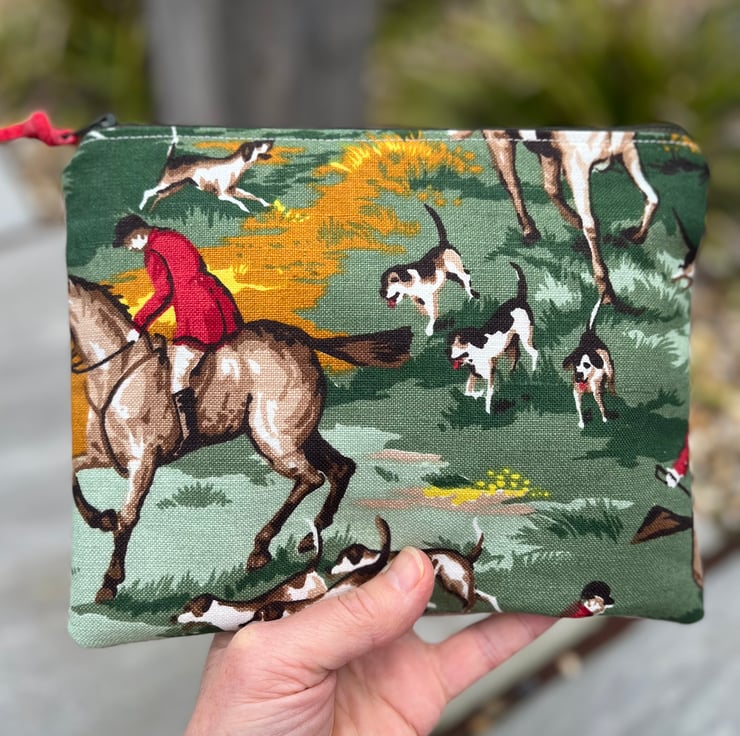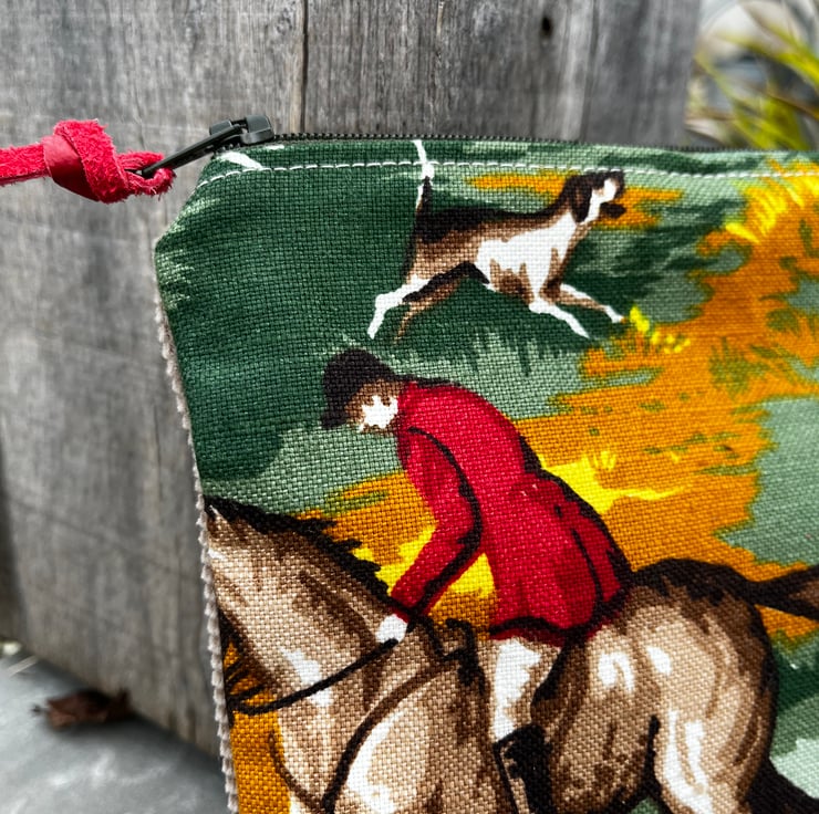 Soft zip pouch made from vibrant vintage horse and hounds linen from the 1950s. The pouch is backed with beige corduroy taken from a sample swatch.