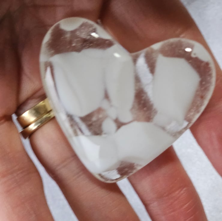 A perfect small gift to show someone you care for them. Or beautiful to keep or yourself. Many people find comfort in having an item to handle in their pocket. Hand cut and kiln fused, a unique item. Very tactile lightly textured underneath and glossy smooth on top. Will arrive wrapped in tissue and in a plain white box tied with ribbon. It can be posted directly to the gift recipient with a printed message of your choice. Approximately 5cm/2" at the widest point. The gift box is 6cm/2.5" square. Please note outer packaging may be recycled.