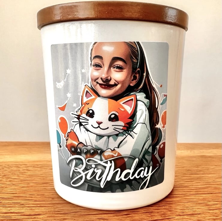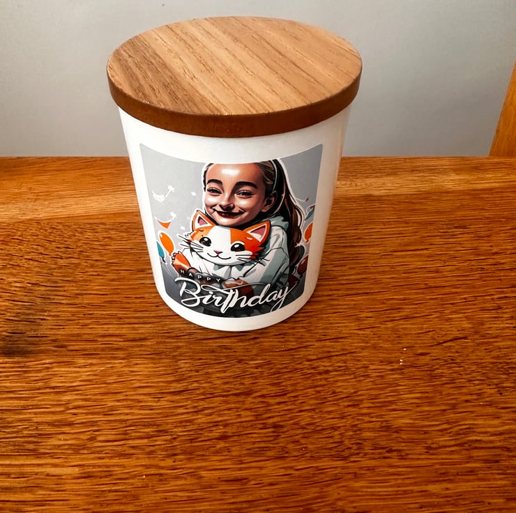 Our Personalised Character Candles are great for all occasions, just send us a photo of the person and we will produce a character of them, also you can choose your own scent from our range. Our candles are homemade and come with double wooden crackling wicks. The candle container is a White Gloss 30CL Lotti jar and has a Natural wooden lid top.