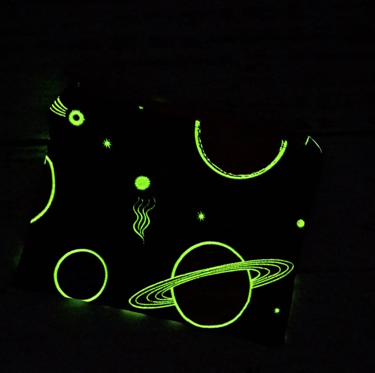 Fun space themed coin purse perfect for coins, bank cards and paper money or for storing small items. This fun fabric will glow in the dark if held under a bright light for a few minutes. Keep under light for longer if you want a longer "glow".