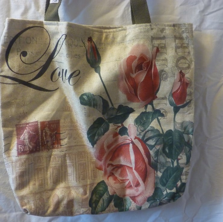 The pattern on these tote bags is a print taken from French flower descriptions. It is a colourfuldesign incorporating 'LOVE' and red roses and a butterfly in the design and the tote bags have the same pattern both back and front, all have my makers label on the long handles and are not only unique to me but there is a limited amount of all three designs. I have a low boredom threshhold so I sew small quantities of the items I make. Strong cotton blend for the outer cover, pure cotton lining and pocket.