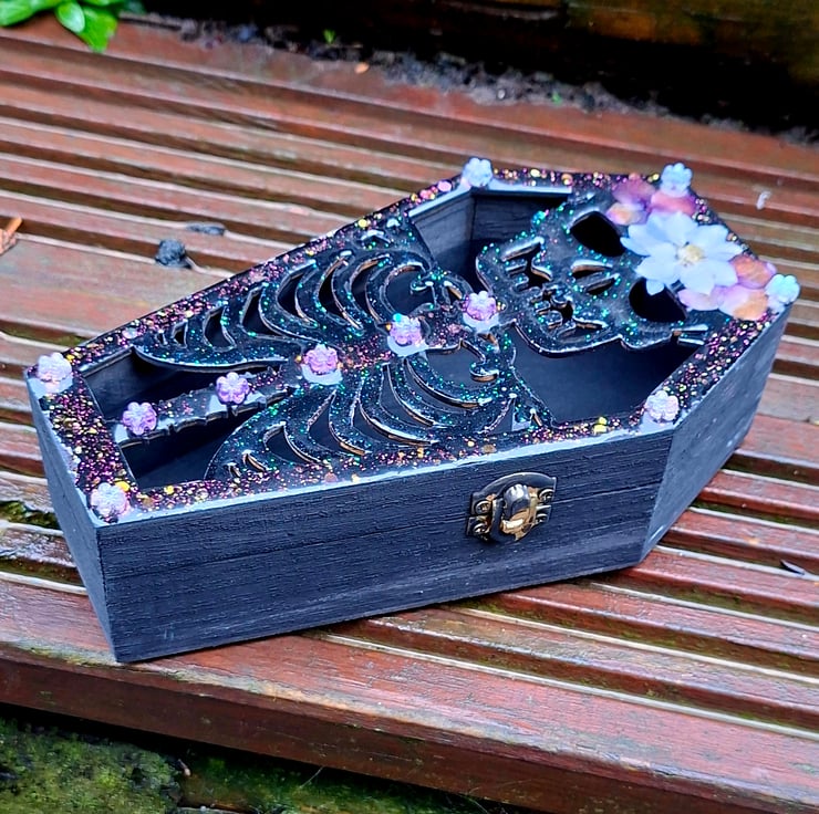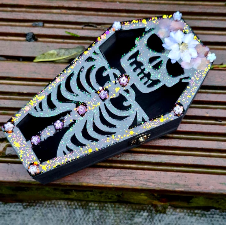 Wooden Coffin Trinket Jewellery Box gothic skeleton spooky cute resin glitter
