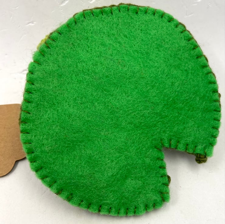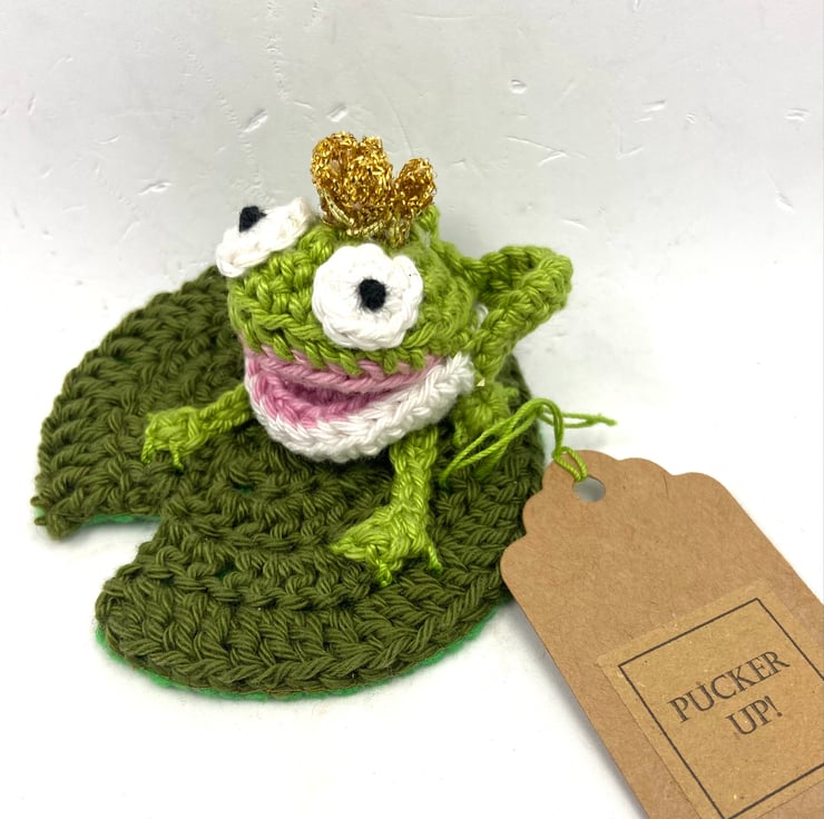 A novel way to send a romantic message to a loved one, this frog and lily pad have been crocheted in cotton and the frog filled with polyester stuffing. The leaf is backed with stiffened craft felt and the frog’s golden crown is made from a fragment of gold braid. The lily pad measures approximately 8cm in diameter and the whole thing measures approximately 4 cm tall. The tag reads Pucker Up! although I am very happy to exchange this tag for one with a message of your choice.