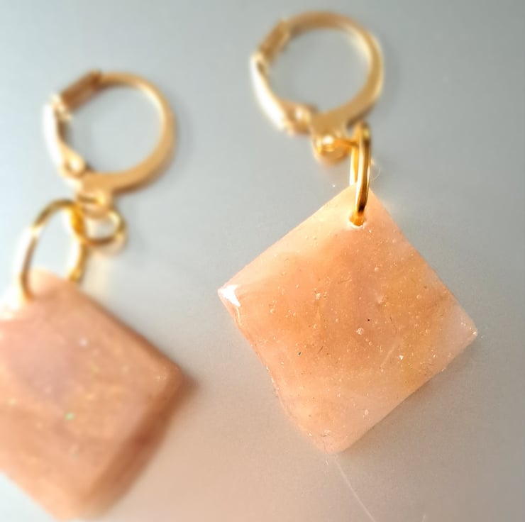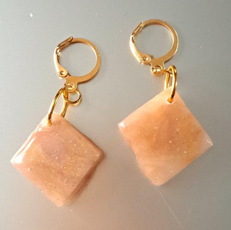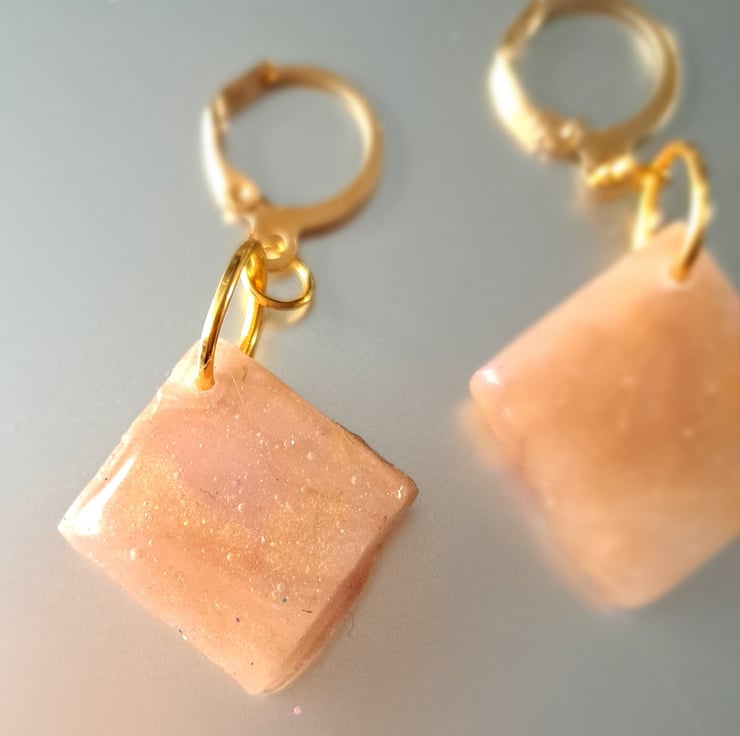 Handmade earrings, square shaped polymer clay, gold and glitter, coated with a layer of resin on a pair of gold plated hooks.