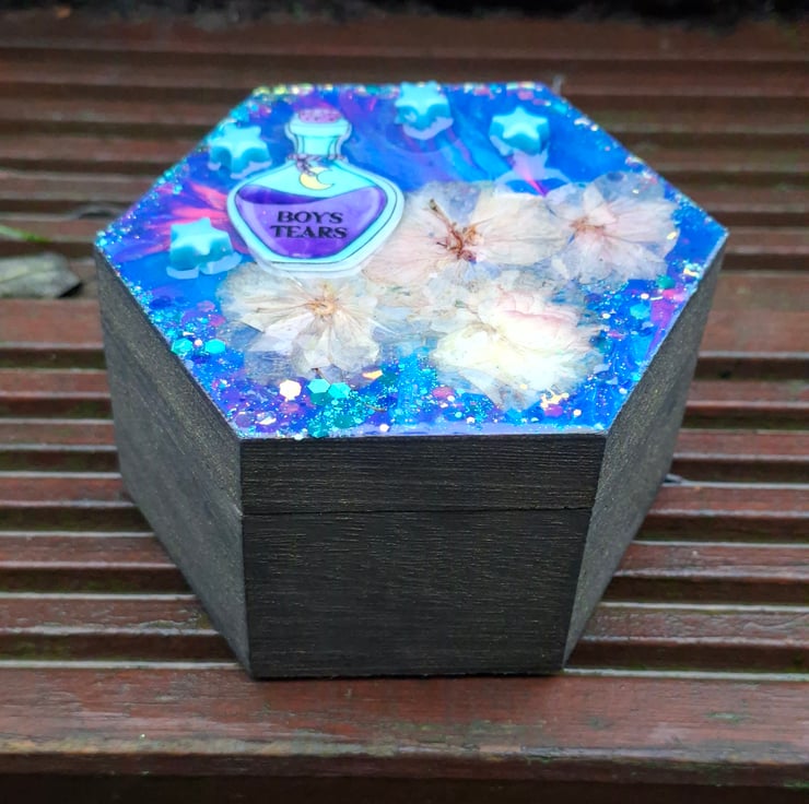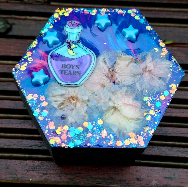 Each Quirken Trovery wooden box has been intricately painted and decorated to a high standard. We use real dried flowers, charms and glitters in our designs, before topping with crystal-clear resin for a glossy finish.