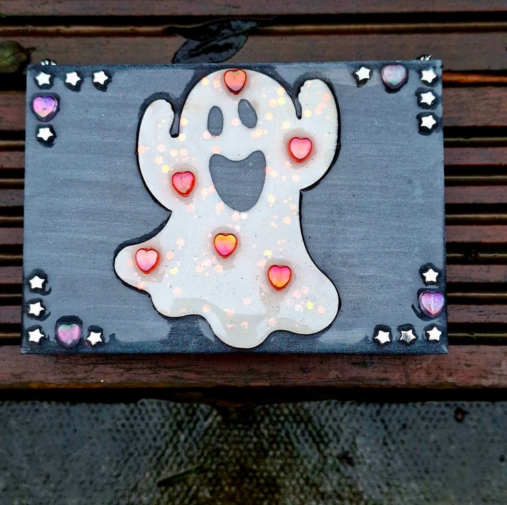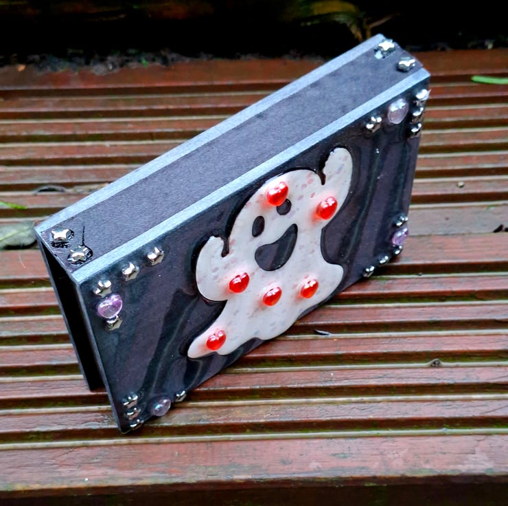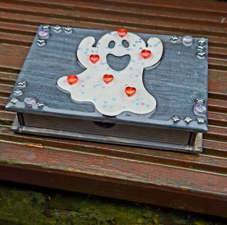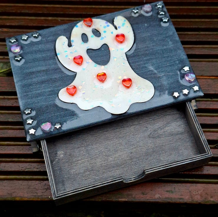 Each Quirken Trovery wooden box has been intricately painted and decorated to a high standard. We use real dried flowers, charms and glitters in our designs, before topping with crystal-clear resin for a glossy finish. This particular box has been given a distressed-look as a finish.