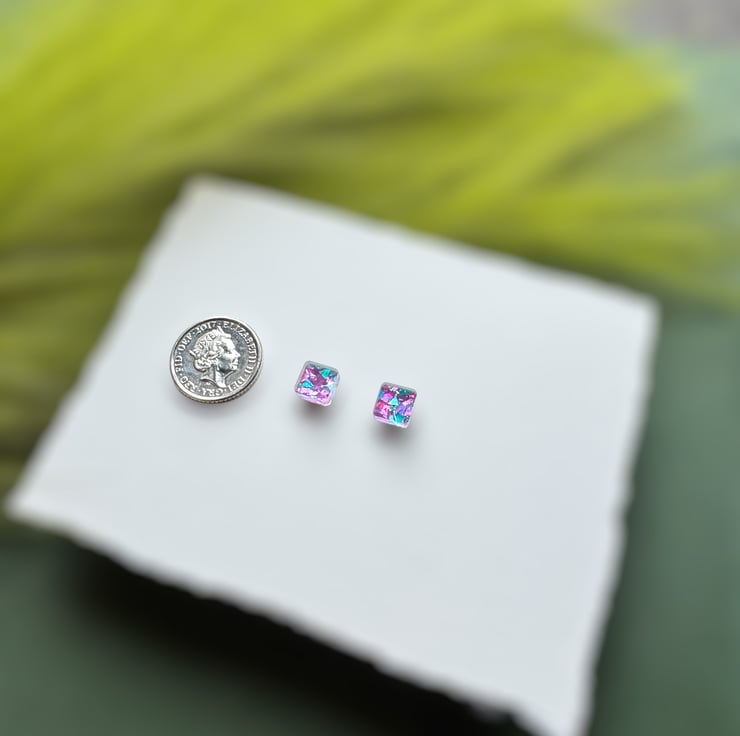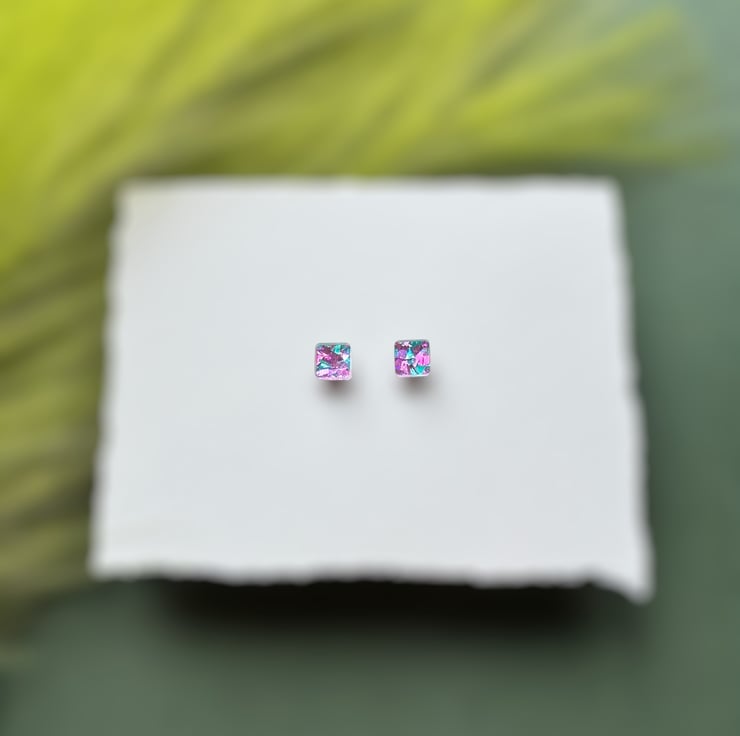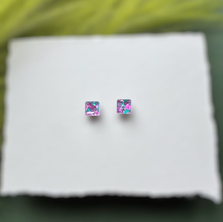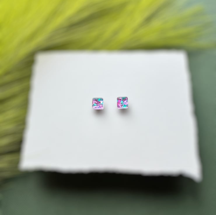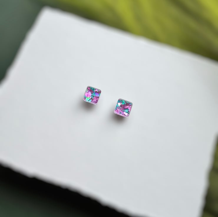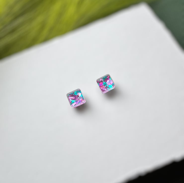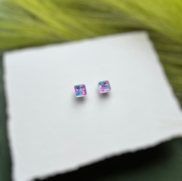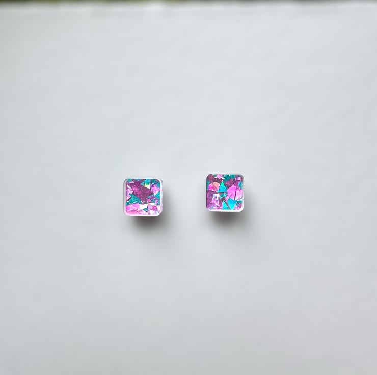 Pretty Pink and Blue Confetti Square Stud Earrings.