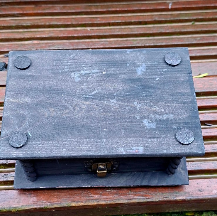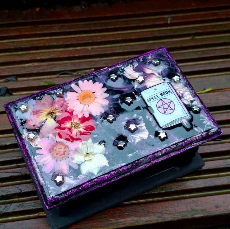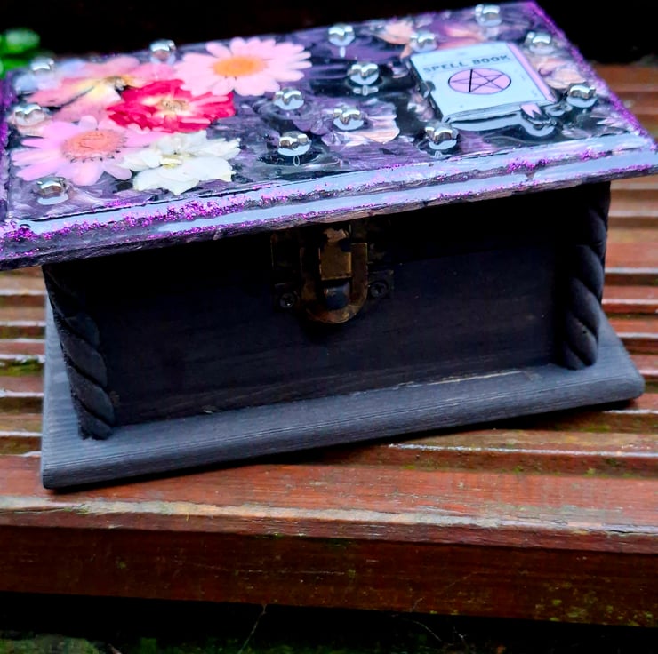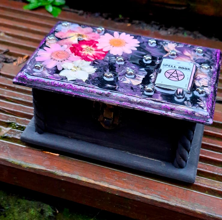 Each Quirken Trovery wooden box has been intricately painted and decorated to a high standard. We use real dried flowers, charms and glitters in our designs, before topping with crystal-clear resin for a glossy finish. These style of boxes have a distressed look.