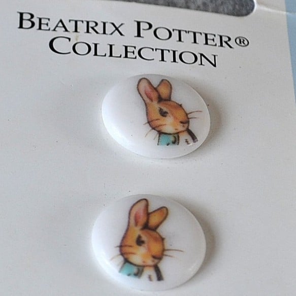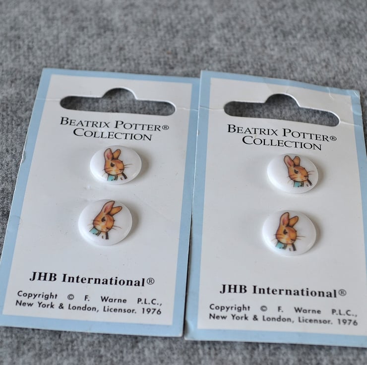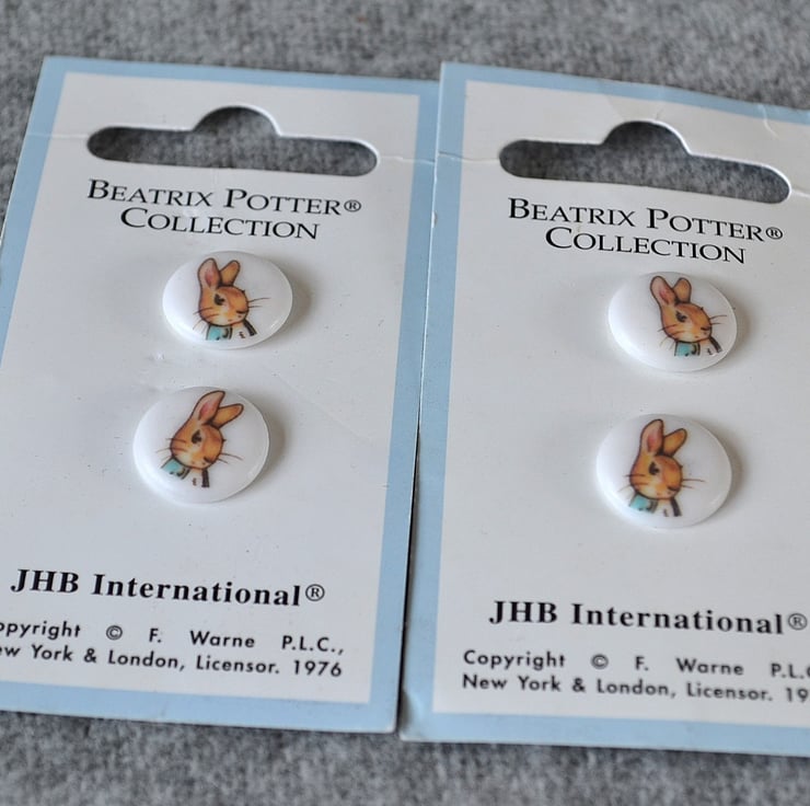 Very rare and extremely hard to find vintage plastic shank buttons featuring Beatrix Potter’s Peter Rabbit. 1 unit of 4 buttons (2 cards of 2 buttons) available.
