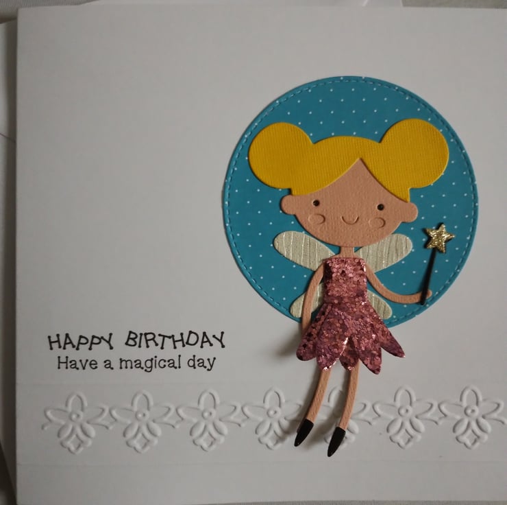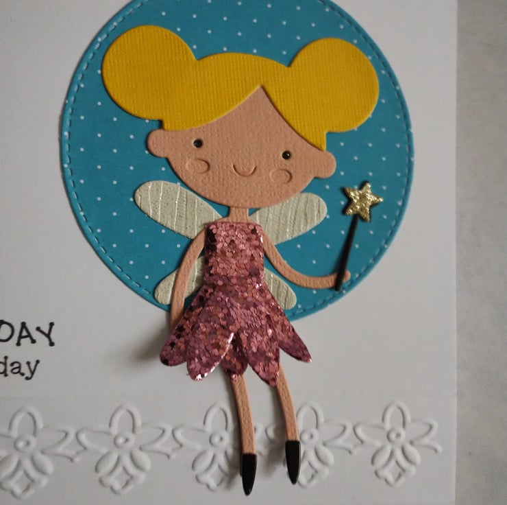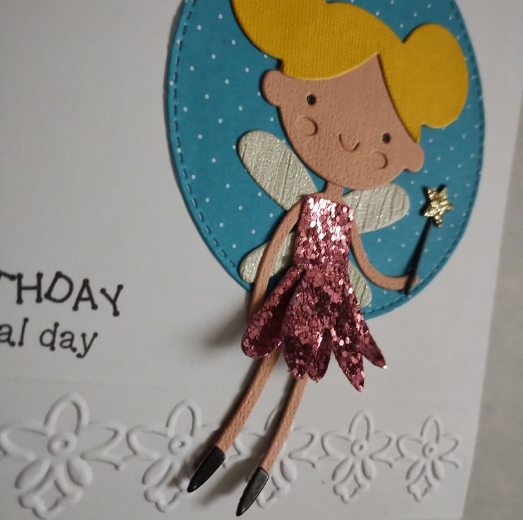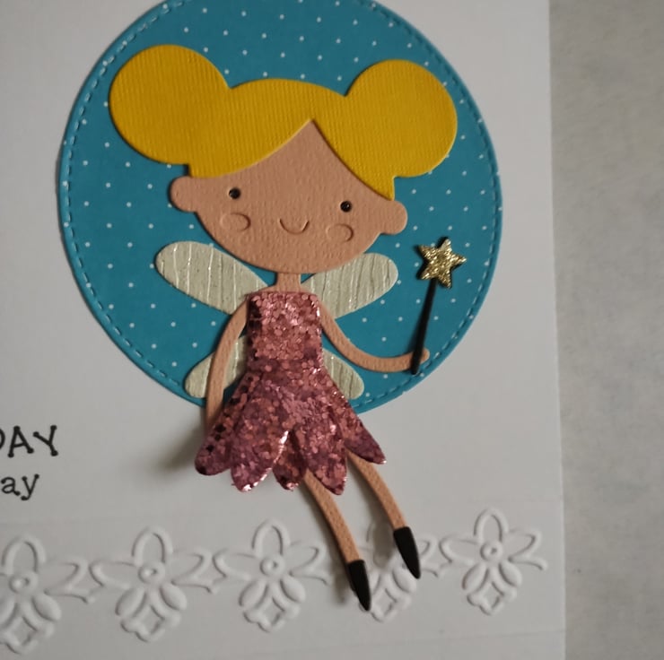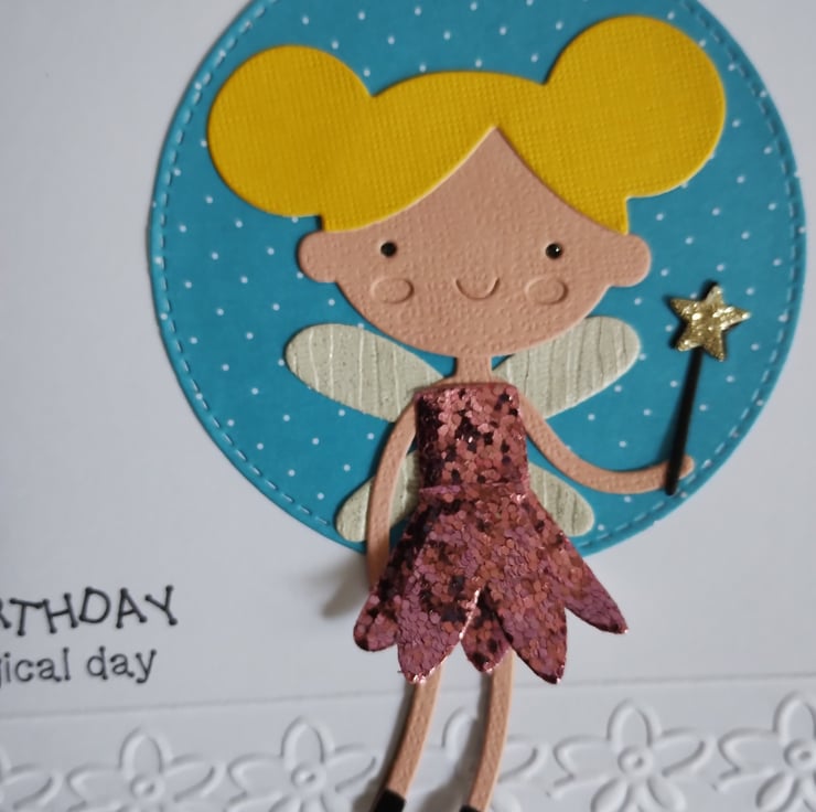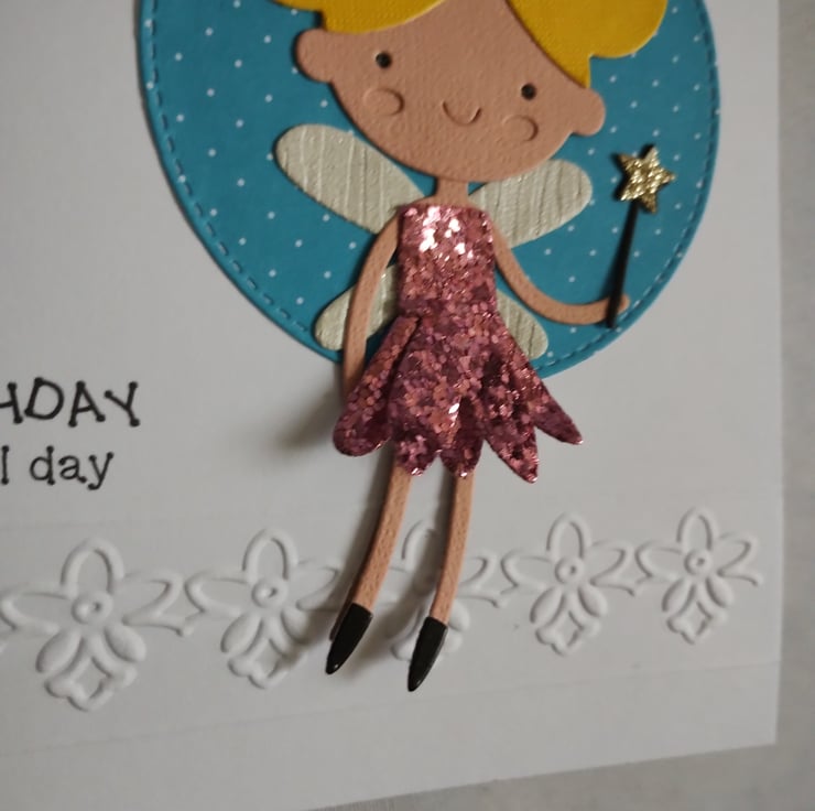 She is cut from textured cardstock and tiny pink sequin premium paper for her dress. The dress has two layers and I've raised the top layer with a little foam square for extra dimension. She's holding her wand which has a tiny golden star. I've added a blue tiny polka dot patterned paper stitched cut circle as background and embossed a line of quirky flowers along the bottom for added texture.