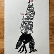 A fantasy scene hand carved in linocut and printed by hand in my home studio.