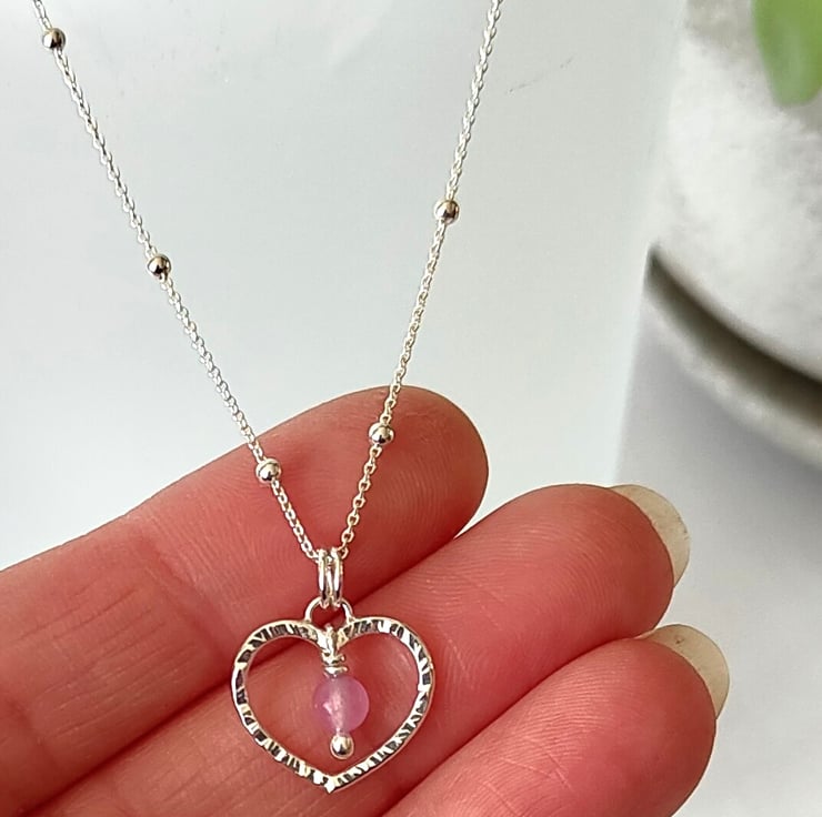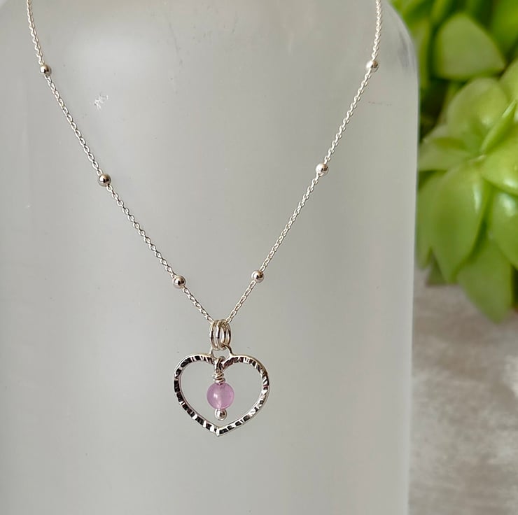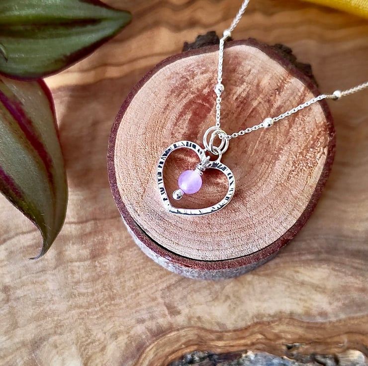 This small sterling silver hammered heart pendant is such a sweet little piece. A 4mm lilac jade gemstone hangs in the centre. I make each one individually and the natural bark effect texture is added by using a riveting hammer, making every one unique and when polished these really do sparkle as they catch the light. Pretty & the perfect gift for a loved one.